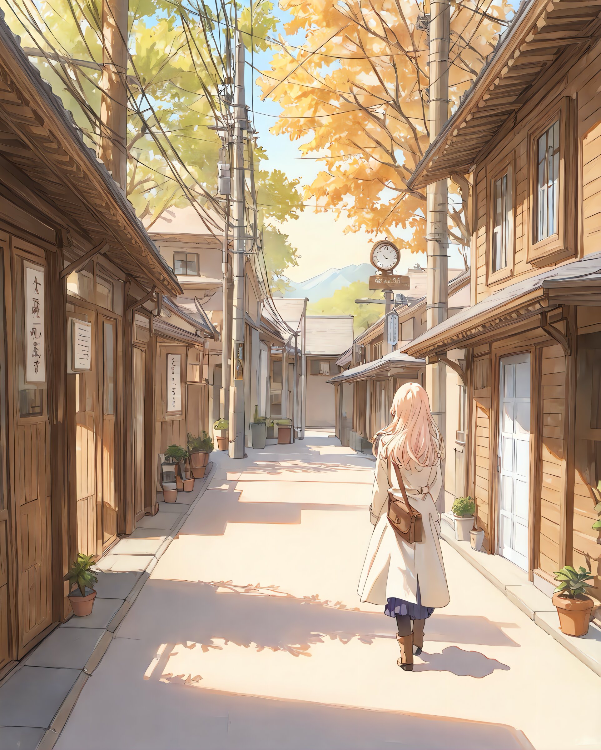 軒先の植木鉢、電柱の張り紙、昼下がりの柔らかな影。