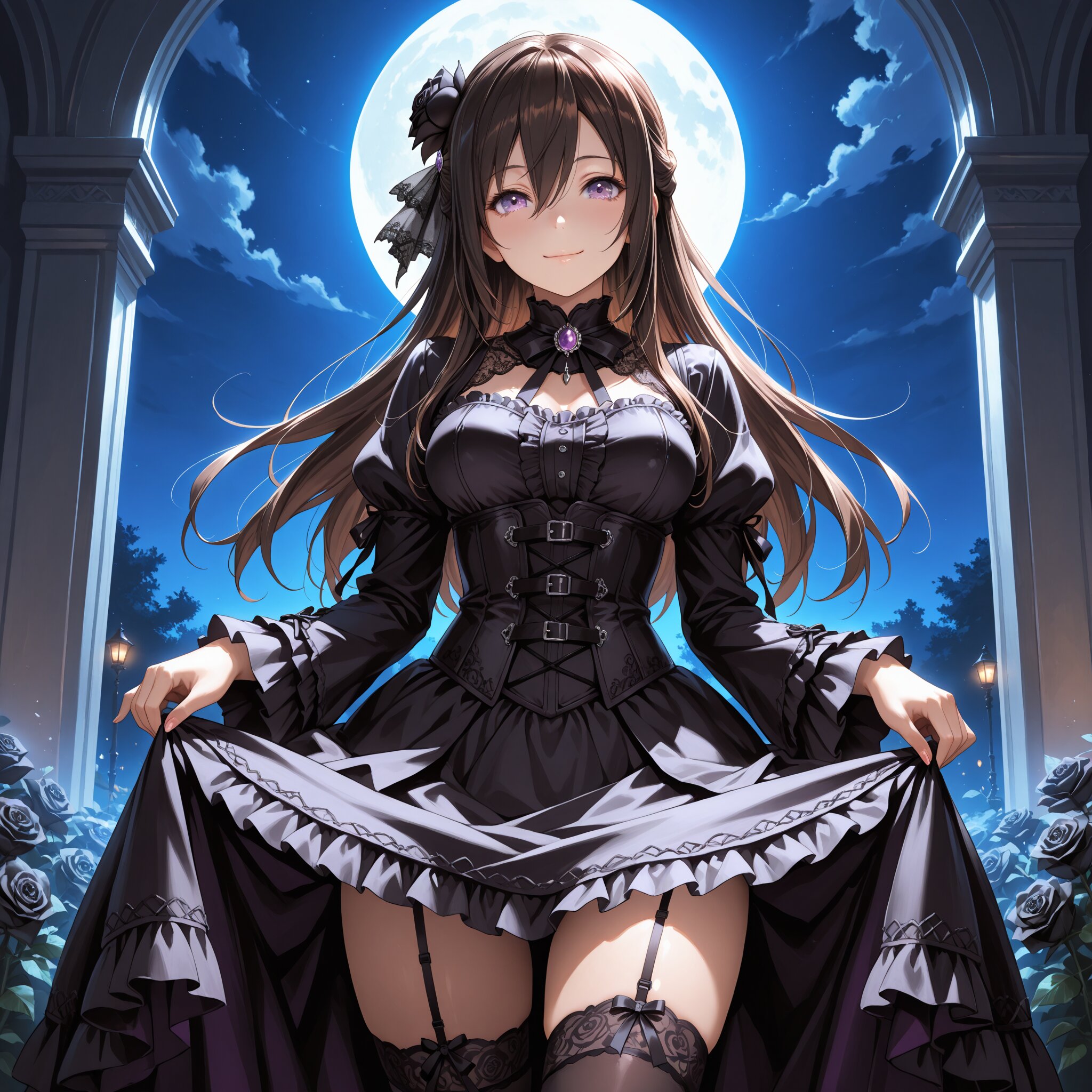 masterpiece, best quality, photorealistic, sharp focus, cinematic lighting, depth of field, beautiful composition, vibrant colors, ultra high res, 8K, highly detailed, masterpiece, best quality, very detailed, score_9, score_8_up, score_7_up, source_anime, yukisuou, lora:yuki-suou-s1-ponyxl-lora-nochekaiser:1, yukisuou, long hair, bangs, brown hair, black hair, hair between eyes, purple eyes, half updo, medium breasts, dark gothic lolita, corset dress, black rose hair ornament, garter straps, thighhighs, zettai ryouiki, hands on skirt, lifting skirt to show thighs, slight smile, mischievous, night, gothic garden, moonlight