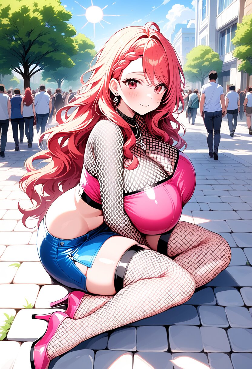 masterpiece, best quality, ultra detailed, 8K, [yokozuwari on pavement]++, [sitting with legs to the side]++, [side sitting pose]++, [thighs touching]++, [legs together]++, [fishnets]++, [fishnet_top]++, [fishnet_sleeves]++, [fishnet_thighhighs]++, [pink high_heels]++, [full_body]++, [crowd]++, [huge breasts]++, perky breasts, hanging breasts, curvy, cleavage, necklace, earrings, midriff, blue miniskirt, BREAK tall, [long hair]++, [shiny]+, [shiny skin]+, [shiny clothes]+, smile, blush, closed_mouth, street, day, outdoors, sun, house, [wavy_hair]++,