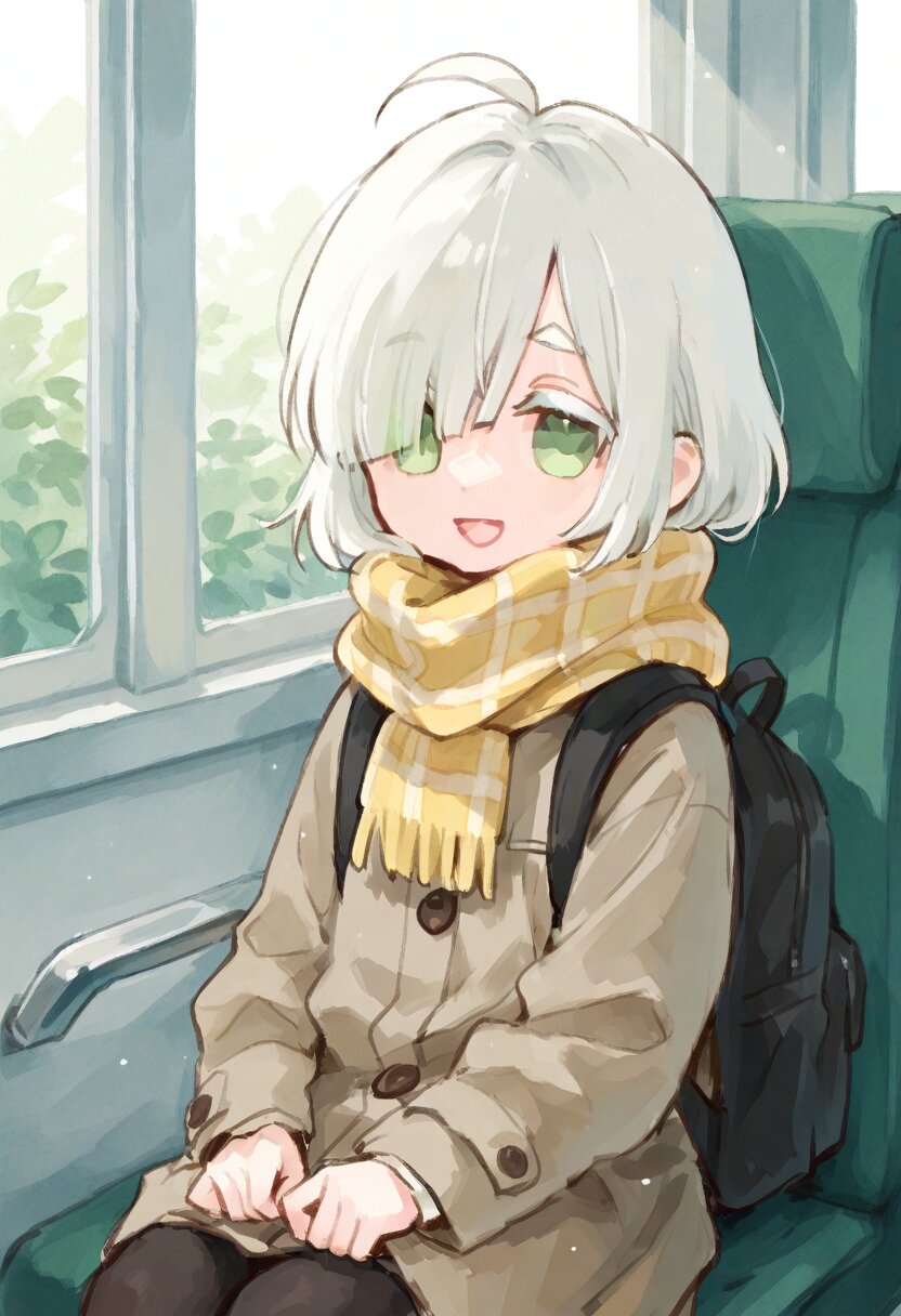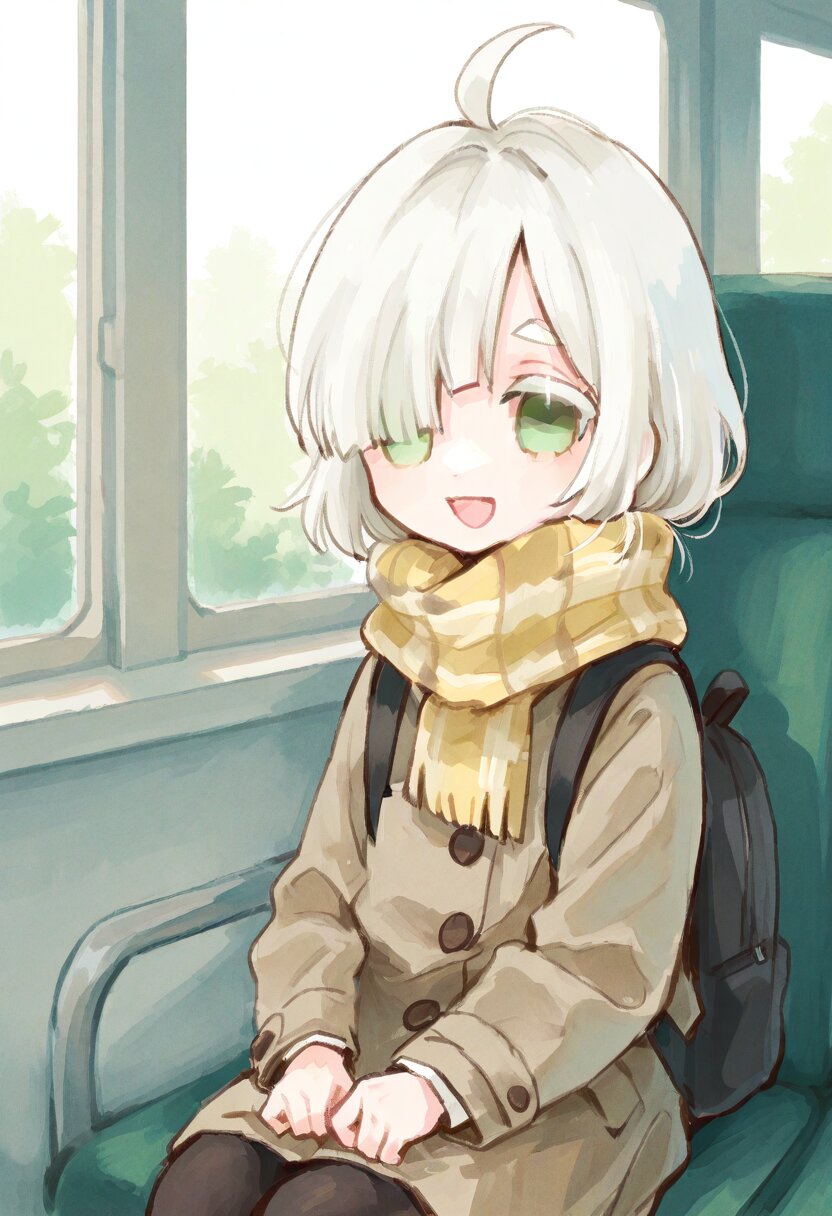 <lora:inmnstyleilxl:0.9>, ultra-detailed, best quality, masterpiece, very aesthetic, watercolor painting, general, 1girl, chibi, solo, upper body, riding the bus, sitting sheet, window, sunlight, (bright white hair), short hair, blunt bangs, white thick eyebrow, white colored eyelashes, (hair over one eye), ahoge, mint green eyes, oversize brown coat, yellow plaid scarf, black backpack, black tights, smile, open mouth, looking at viewer