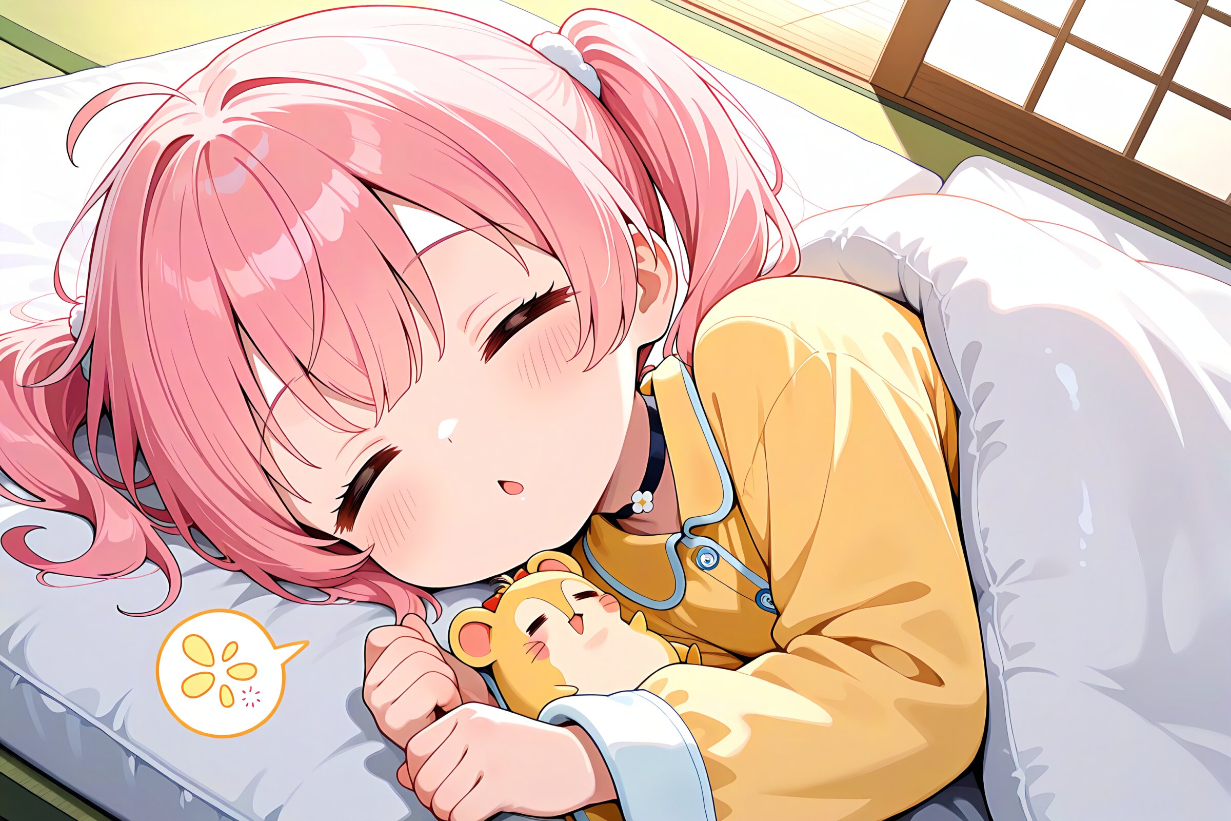1 little girl, solo, upper body, diagonal angle, masterpiece, best quality, amazing quality, very aesthetic, pink hair, twintails, closed eyes, =_=, chestnut mouth, smile, mouth, cheerful, relaxing, squeans, spoken squeans, choker, cute pajamas, lying, sleeping, hamsters, =_=, futon, morning, winter,
