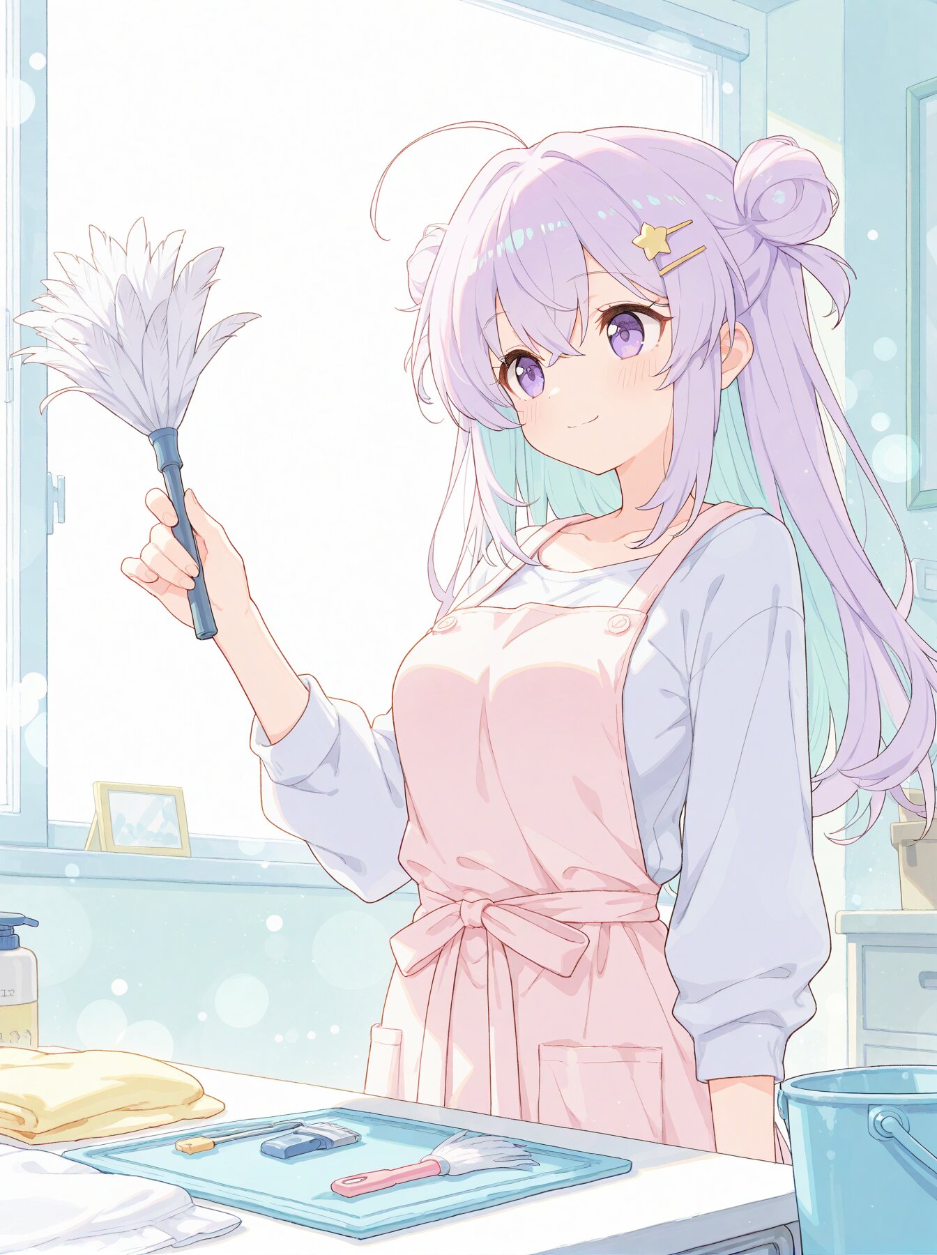 single girl only, solo illustration, year-end big cleaning scene, warm and gentle atmosphere, girl wearing a simple triangle bandana (sankakukin), casual clothes suitable for cleaning or a soft pastel apron, slightly worn but clean outfit, not fancy, holding a feather duster (hataki) in one hand, desk partially cleaned, half of the surface neatly cleared, cleaning tools nearby: cloth, bucket, spray bottle, soft winter daylight coming through the window, cozy room, lived-in feeling, mid-cleaning moment, yumekawaii pastel color palette, calm smile, relaxed posture, small sense of progress, illustration style, soft lines, smooth shading, peaceful and hopeful year-end mood, (soft pastel color palette:1.5), (pale colors:1.3), watercolor texture, matte finish, subtle shading, minimal contrast,, (masterpiece:1.3), (best quality:1.2), dreamy pastel bokeh, soft rim light, crisp anime lineart, soft cell shading, high detail, elegant atmosphere, Pastel color palette, (Upper body: 0.9), soft cute girl with soft lavender hair and light blue inner highlights, long hair with two side buns and loose curls, one stray hair, large, bright purple eyes, a gentle smile, a faint glow, anime-style with emphasized contours, flat pastel-toned shading.single ahoge, medium breasts,star-shaped hairpin,