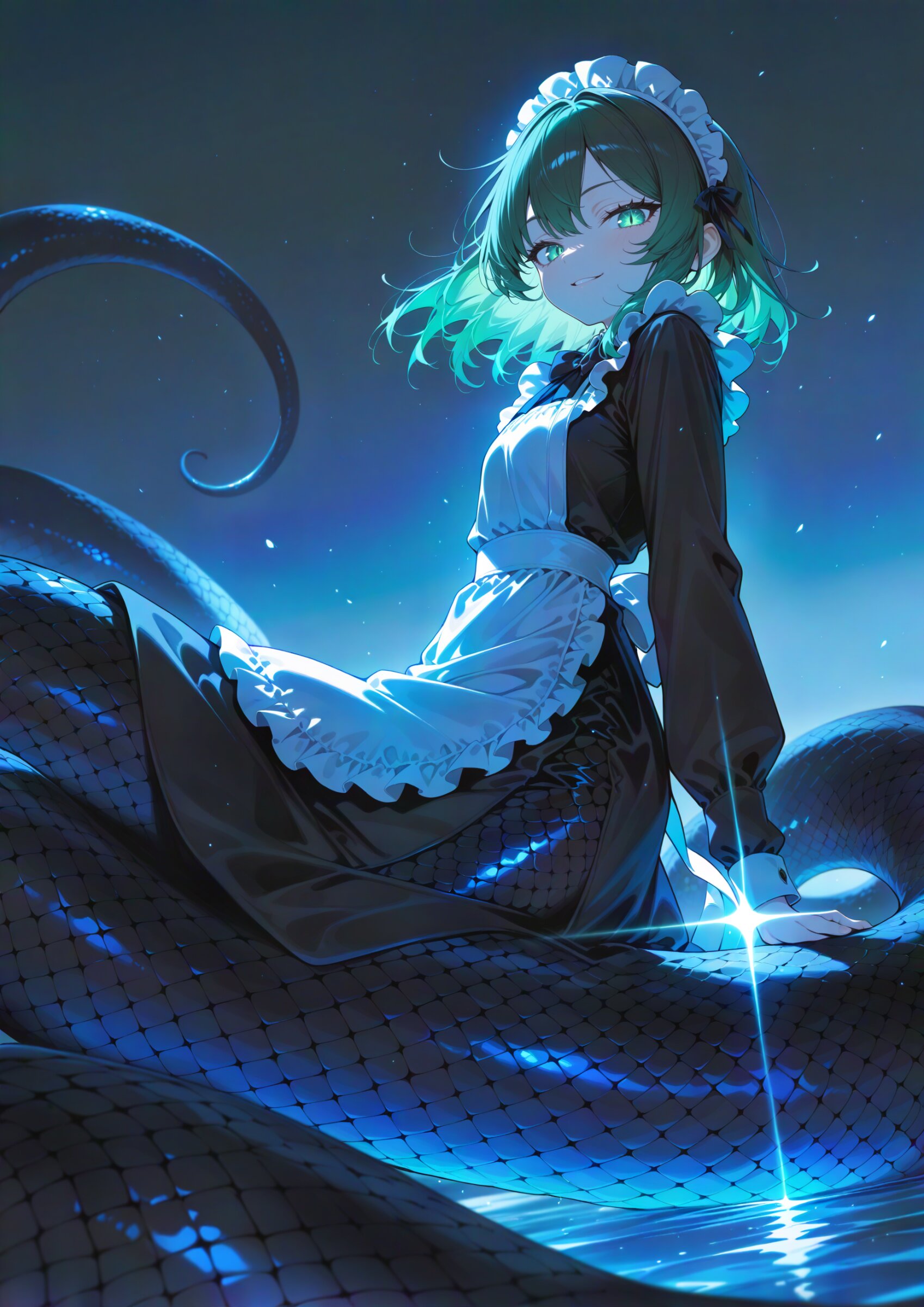 from side, looking at viewer, (close to viewer:1.0), knees out of frame from below, looking down looking at viewer, (dutch angle:1.2) winter atmosphere, earthy color, winter theme, 1girl, (ultra-detailed), solo, maid, pale skin, pale dark green hair, (beautiful slit pupils, naughty face:1.0), long sleeves classic maid uniform, long skirt, maid headdress, maid apron, luminous effect lens flare shiny-glistening cute girl solo cinematic angle, Low Horizon, ((lamia:1.1), slit pupils, , Calisthenics, huge dark green snake leg:1.1), super fine concept art, 8K, graceful eyes, masterpiece, best quality, amazing quality, very aesthetic, absurdres, newest, professional art lots of details, , overexposure, sumi-e effect style, 4ur4_illu,shiny, glowing, glowing particles, glowing light particles, light particles, black ice, <lora:noline (1):-0.5> <lora:sdxl2-flat2-512b:-0.2> <lora:facelightup_xl_v10:0.5> <lora:V2_yakumo_alchemy:0.5> <lora:Aura_illu:0.1>