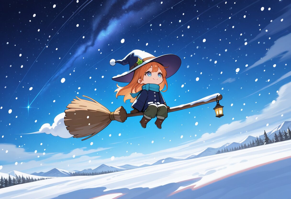masterpiece,best quality,highres,ultra detailed,highly detailed,detailed eyes,perfect anatomy,general,witch,witch girl,(in the sky,in the air,flying sky),chibi,smile,sitting broom,broom riding,witch hat,winter clothes,very long jacket,scarf,very long cargo pants,gloves,boots,snow,snowing,fantasy,dutch angle, from above,