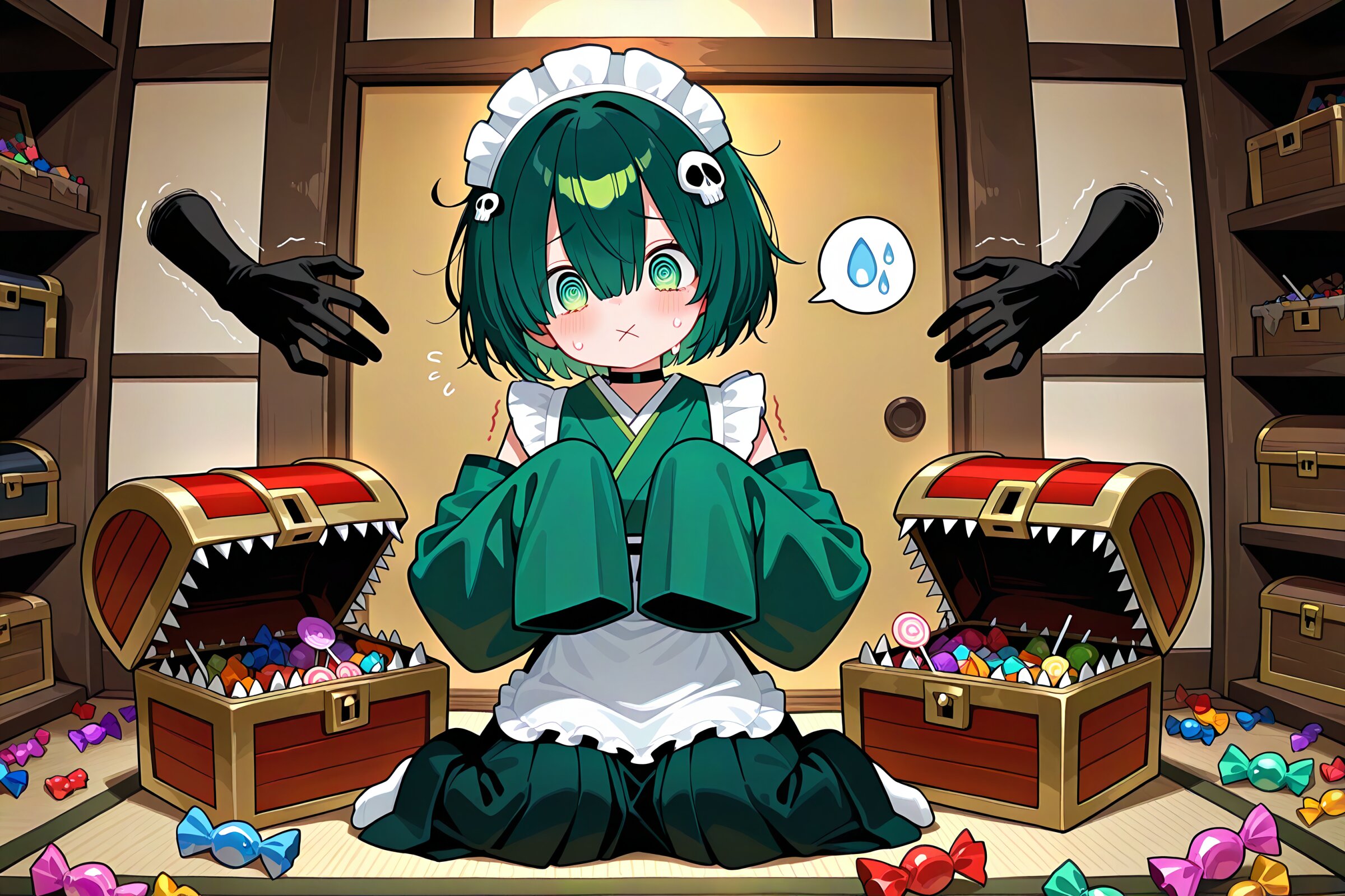 1 little girl, solo, masterpiece, best quality, amazing quality, very aesthetic, cobalt green hair, short hair, messy hair, (hair over eyes:0.8), green eyes, demon fangs, @_@, troubled, confused, tearful eyes, (:x:1.2), sweat, flying sweatdrops, spoken sweatdrop, choker, green wa maid outfit, hakama skirt, (oversized sleeves:1.2), detached sleeves, skull hair ornament, wariza, clinging box, (floating black ghosty hands:1.2), trembling, mimic chest, many many candy, messy room, lollipop, japanese room,