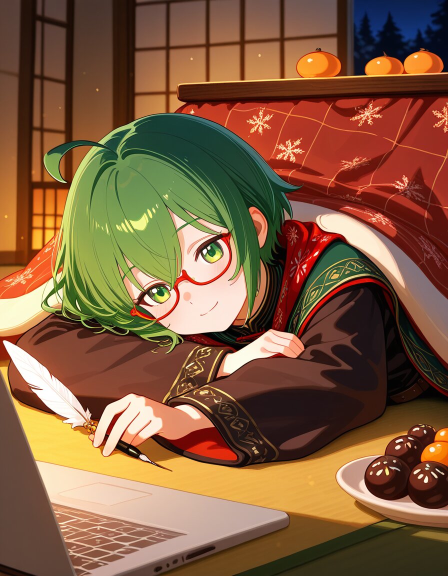 1boy, otokonoko, androgynous, cute face, soft smile, slim body, flat chest, feminine features, short green hair, neat short haircut, slightly tousled, ahoge, single ahoge strand sticking up, glossy hair, green eyes, emerald green eyes, detailed eyes, wearing red glasses, red framed glasses, holding a quill pen, feather pen in hand, ink-stained fingers, artist hands, fantasy illustrator outfit, layered medieval-style clothing, long tunic with embroidered patterns, leather belt with small pouches, scroll case on the back, soft fabric cape, magical ornament accessories, fantasy world, warm lighting, fantasy illustration style, high detail, clean lineart, soft shading masterpiece, best quality, ultra detailed, New Year's Eve night, late December, cozy Japanese living room, traditional kotatsu, a person sleeping at the kotatsu, fell asleep unintentionally, relaxed and defenseless pose, upper body resting on the kotatsu table, peaceful sleeping face, calm expression, warm ambient lighting, soft orange glow from inside the kotatsu, dim room, quiet night atmosphere, nostalgic and cozy mood, on top of the kotatsu: an open laptop with a softly glowing screen, several mandarins (mikan), mizuyokan Japanese sweets on a small plate, cinematic lighting, soft shadows, shallow depth of field, highly detailed background, comfortable, heartwarming atmosphere