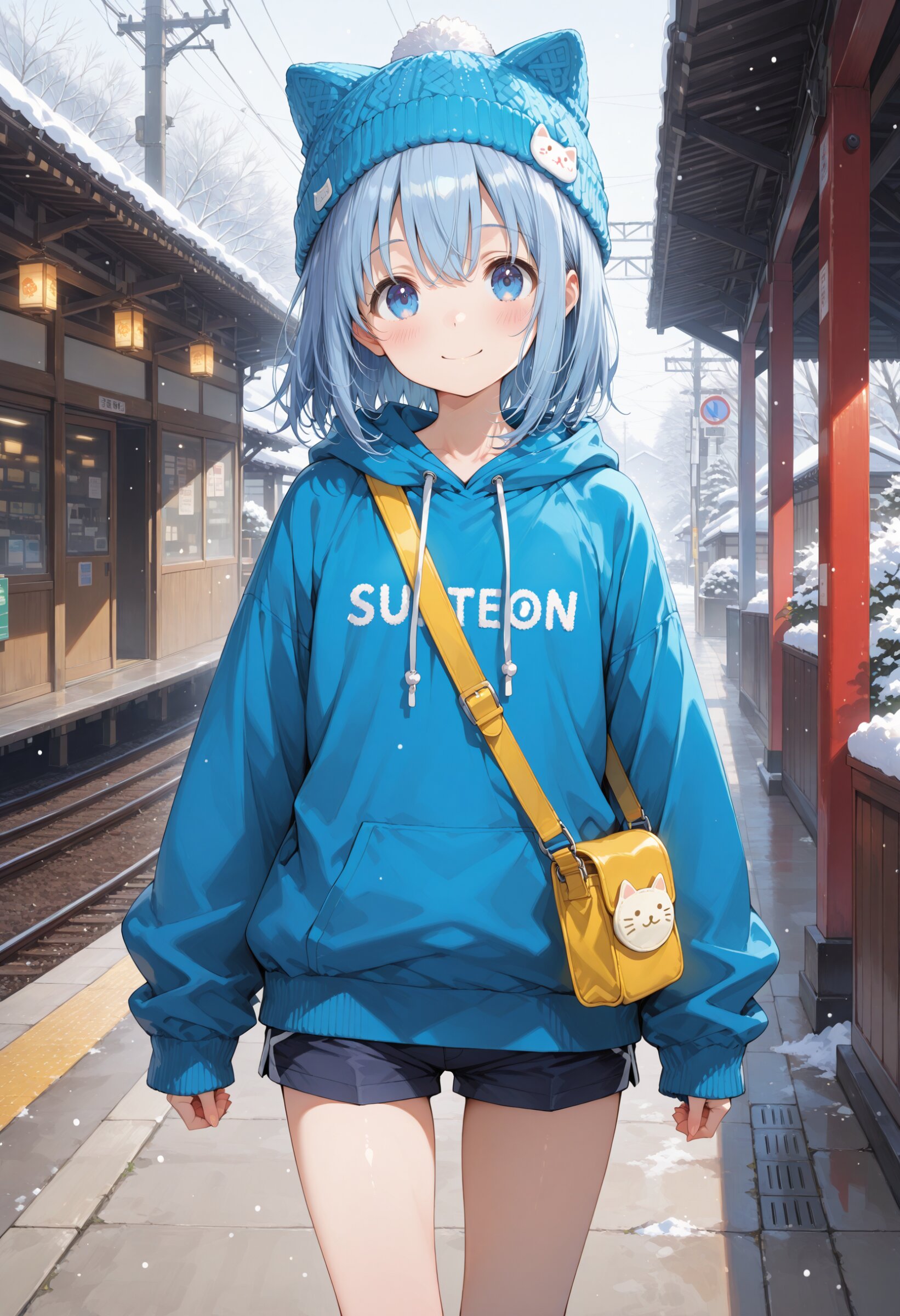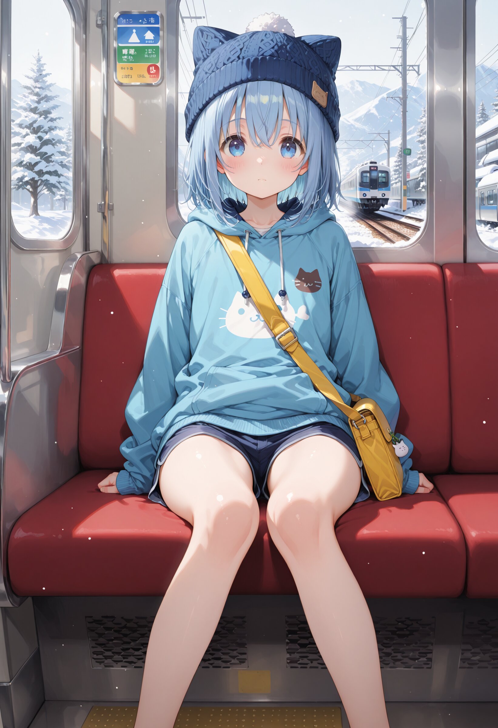 masterpiece, best quality, highres, ultra-detailed, extremely detailed, detailed, 1boy, shota, kawaii, light blue hair, medium hair, blue eyes, cat ear style knitted hat, blue hoodie, short pants, long sleeves, moe sode, Sleeves past wrists, slim legs, winter, train interior, sitting on seat, innocent expression, from side, small cloth shoulder bag, Snowy landscape,