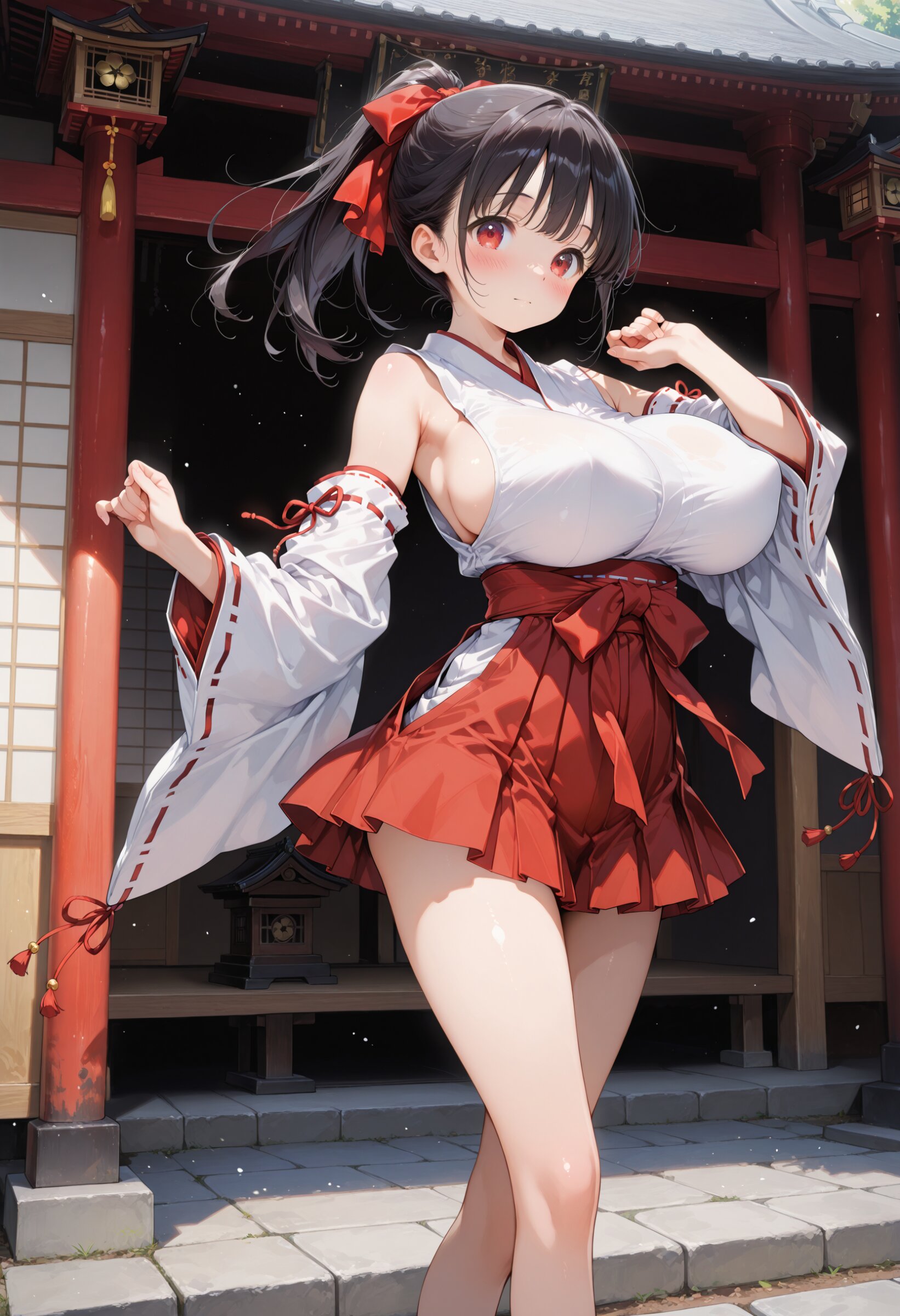 masterpiece, best quality, amazing quality, general, fine detail, official art, 1girl, (loli:1.2), beautiful black hair, Ponytail, beautiful red eyes, red ribbon miko, red hakama, miniskirt, detached sleeves, huge breasts, erect nipples, perky breasts, bare shoulders, slim legs, slim hip, Japanese shrine, dancing, dynamic action, innocent expression, blush, jewelry,