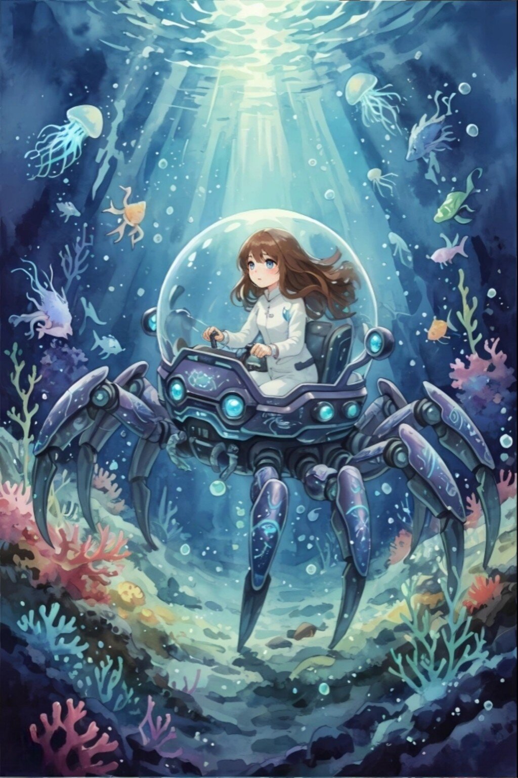 A brave young girl with long brown hair, wearing a white suit, piloting an intricate, dark blue, crab-shaped robot with glowing turquoise accents, in a clear bubble cockpit, as she explores a vibrant and mysterious deep-sea environment. The scene is rendered in a beautiful watercolor style, with colorful coral reefs, various deep-sea creatures like jellyfish and fish, and shafts of light penetrating the water from above.