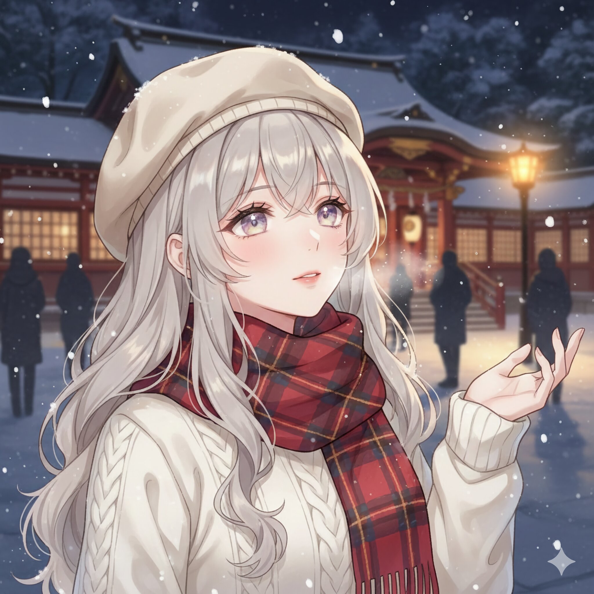キャラは用意しています。女性の年齢は若年成人。 雪が少し降っている夜の神社に、大晦日やってきた女性。 手のひらで雪を確認するポーズ。冬の空を見上げる。 他の参拝客は全てシルエット。 高精細。アニメ風。 **極度に繊細な線画,細い線** **柔らかな陰影,非常に綿密な,複雑なディティール** **淡い水彩,透明感のある水彩,柔らかな水彩** (masterpiece,best quality:1.4)、高解像度。 クローズアップのポートレート。 表情のみのショット。 (女性の特徴) 下まつげ強調。 美しい女性。聖母のような優しい表情。 優美で、穏やかな、静謐。 モデルのような透明感のある美人。 白い吐息。 reflected light in eyes. 女性と背景のパースは自然に合わせること。