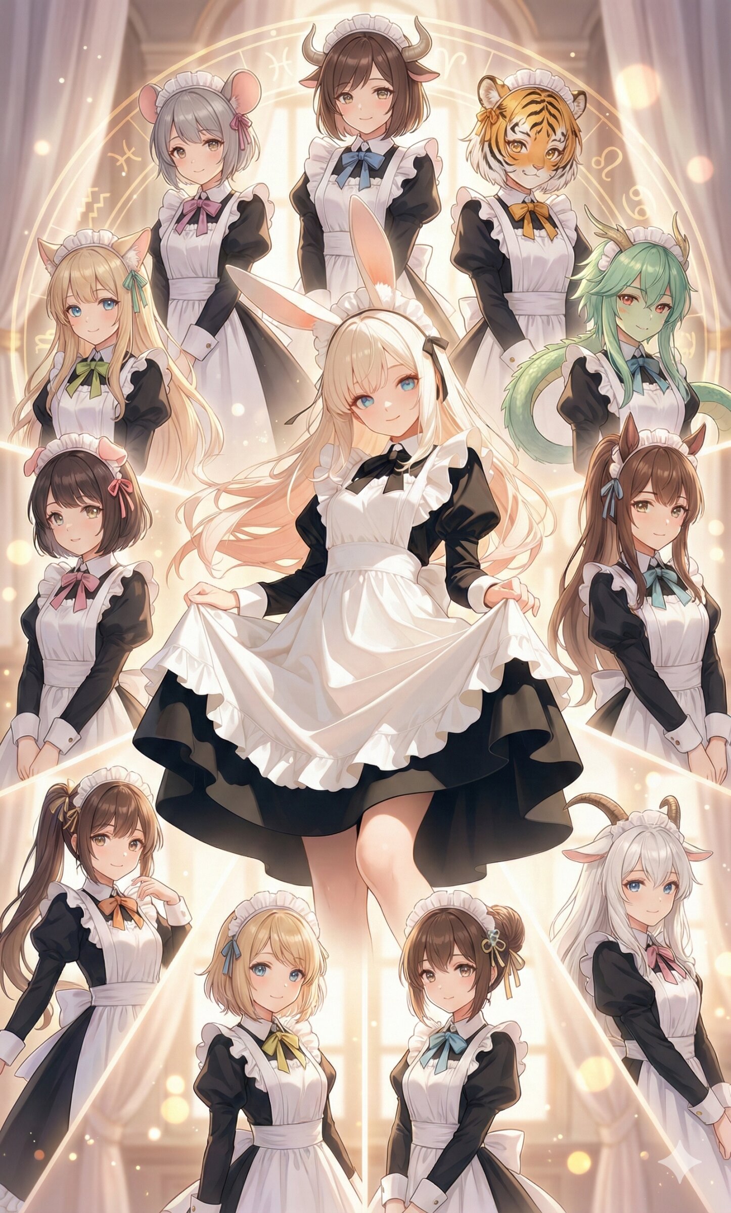 (masterpiece, best quality, highres, 8k wallpaper:1.2), extremely detailed, (soft lustrous skin), 12 girls, zodiac-themed maid collection, fantasy illustration, central focus: rabbit zodiac maid, bunny ears headband, elegant maid outfit, white and pastel tones, gentle smile, performing a graceful curtsy, main heroine presence, surrounding characters: 11 zodiac maids inspired by rat, ox, tiger, dragon, snake, horse, goat, monkey, rooster, dog, pig, each with subtle animal motifs (ears, hair ornaments, patterns), coordinated maid costumes with individual color accents, harmonious design unity, soft natural eyes, subtle irises, long eyelashes, refined expressions, (cinematic lighting), soft diffused light, bloom, tyndall effect, rim lighting, glowing atmosphere, skin-friendly lighting, composition: collage-style arrangement, circular layout, layered depth, rabbit maid slightly forward in the center, other zodiac maids arranged symmetrically around her, overlapping silhouettes, dynamic balance, depth of field, rule of thirds, background: elegant fantasy interior, soft curtains, zodiac-inspired patterns, warm light filtering through, floating dust particles, atmospheric haze, bokeh, unobtrusive blurred background, transparent air, dreamy, fairy-tale mood, high-end commercial illustration, collectible visual, ensemble artwork