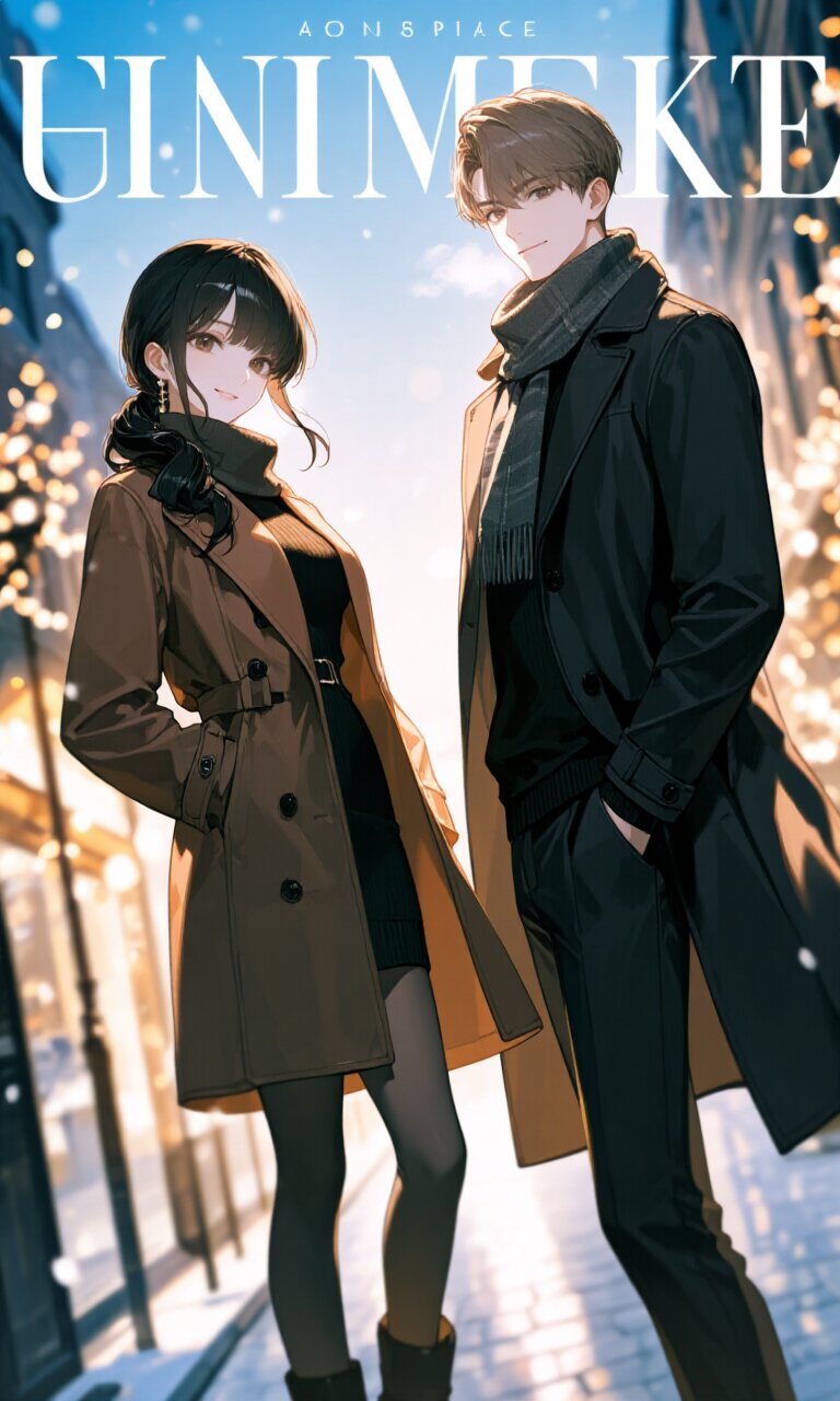 (masterpiece, best quality, highres, 8k wallpaper:1.2), extremely detailed, (ultra-detailed eyes, sparkling eyes:1.1), (soft lustrous skin), 2people, handsome young man and beautiful woman, stylish winter fashion couple, young man with light brown short hair, dark brown eyes, refined facial features, calm and confident expression, tailored winter coat, layered knitwear, scarf, elegant and modern menswear, beautiful woman with black hair in a side-tail, glossy hair, graceful silhouette, feminine and chic winter outfit, long coat, knit dress, tights, boots, mature beauty, gentle smile, (cinematic lighting), soft winter sunlight, cool yet warm color balance, (soft focus), rim lighting, subtle bloom, tyndall effect with faint snow particles in the air, (glowing light:0.8), transparent and airy atmosphere, dynamic angle, depth of field, rule of thirds, both looking at viewer, natural pose, fashionable couple photoshoot composition, urban winter street background, classy cityscape, blurred lights, seasonal decorations, bokeh, shallow depth of field, background softly blurred to emphasize the characters, elegant, romantic, commercial illustration, fashion magazine cover style