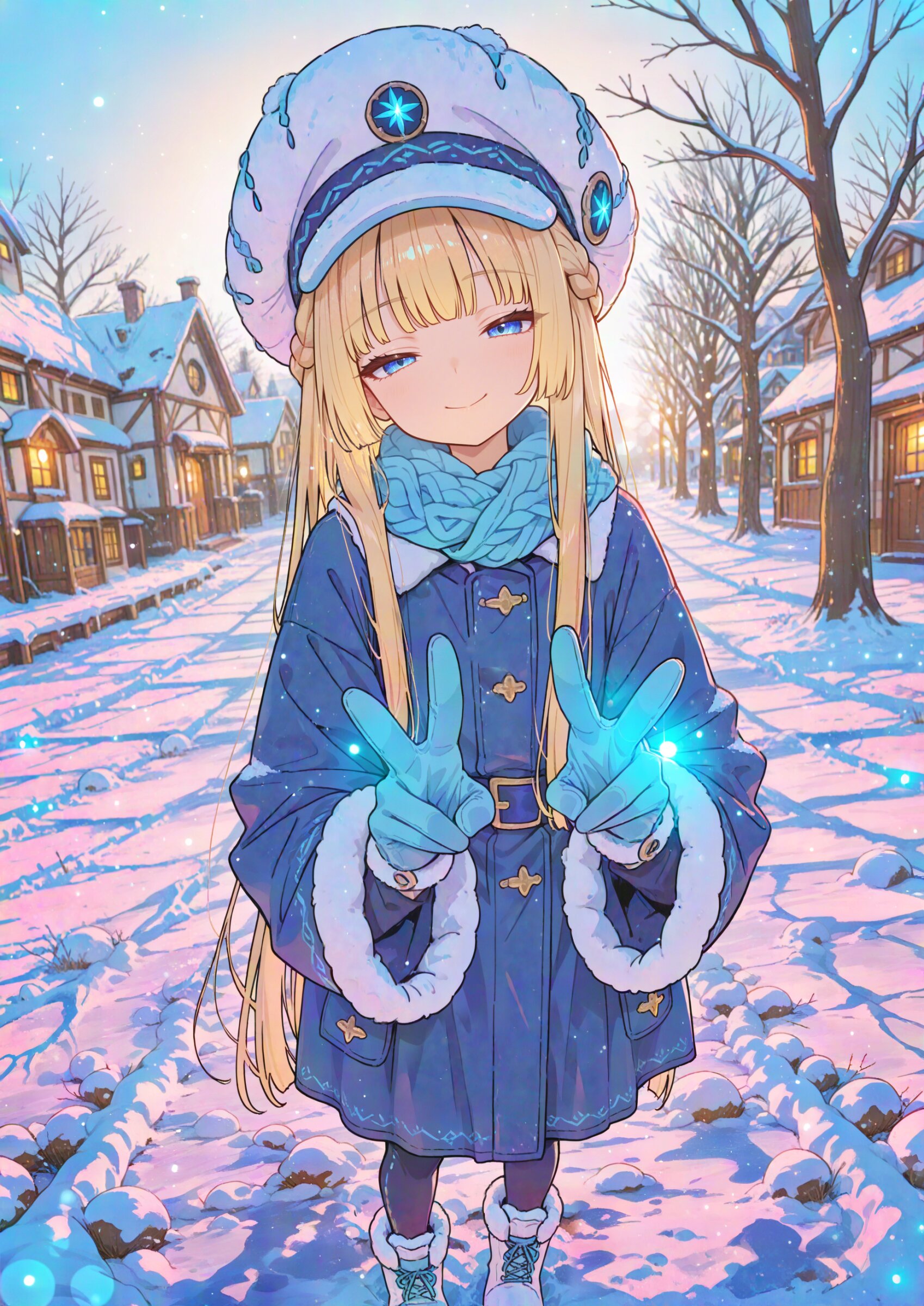 (fisheye,fisheye lens angle:1.0), focus breast looking at viewer (flat chest, 1girl (13yo:1.1), very long hair, french braid, straight hair, hime cut, blond hair, blue eyes, closed mouth smile, sleepy expression, drowsy, tired, fatigued, double v:1.0), winter atmosphere, blue fur-trimmed coat, winter scarf, winter gloves, long sleeves, winter pants, winter boots, fantasy alternate japan rural, bare tree, snow, day, town, bare tree winter, , depth of field, bokeh, backlighting, afternoon, super fine concept art, hard surface, 8K, unreal engine, masterpiece, best quality, amazing quality, very aesthetic, absurdres, you can add scenery, (volumetric lighting), To make the background more distinctive. professional art lots of details, , overexposure, shiny-glistening, (watercolor style:0.0), (pastel color style:0.0) 4ur4_illu,shiny, glowing, glowing particles, glowing light particles, light particles, pastel colors silver large hat , <lora:noline (1):-0.5> <lora:sdxl2-flat2-512b:0.2> <lora:facelightup_xl_v10:0.5> <lora:V2_yakumo_alchemy:0.2> <lora:Aura_illu:0.1>