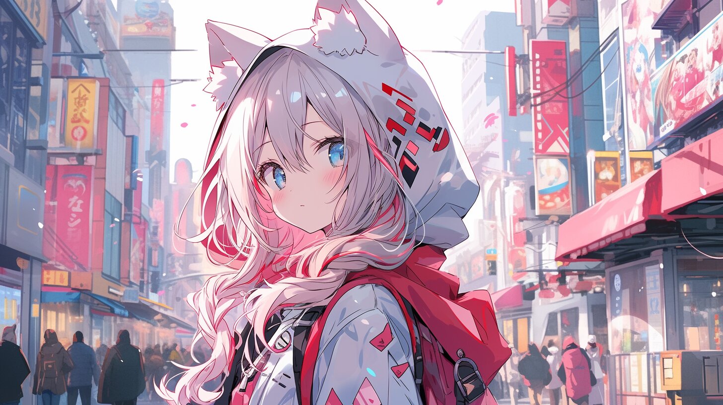 賑やかな街路を歩く猫耳フードの少女。ピンクの髪が風に揺れ、青い瞳が誰かを探すように振り返る。桜の花びらが舞うこの瞬間、彼女は失われた友達との再会を夢見て、バックパックに詰めた冒険の記憶を抱きしめる。街の喧騒の中で、どんな物語が始まるのか? 彼女の小さな旅は、意外な出会いを呼び寄せるかもしれない。