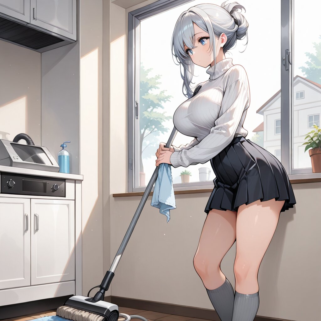 1girl, long hair, silver hair, updo hairstyle, light blue eyes, large breasts, oversized white knitwear, black pleated skirt, gray thighhigh socks, cleaning window, cleaning, house cleaning, vacuum cleaner, wiping with cloth, sweeping with broom, masterpiece, ultra detailed