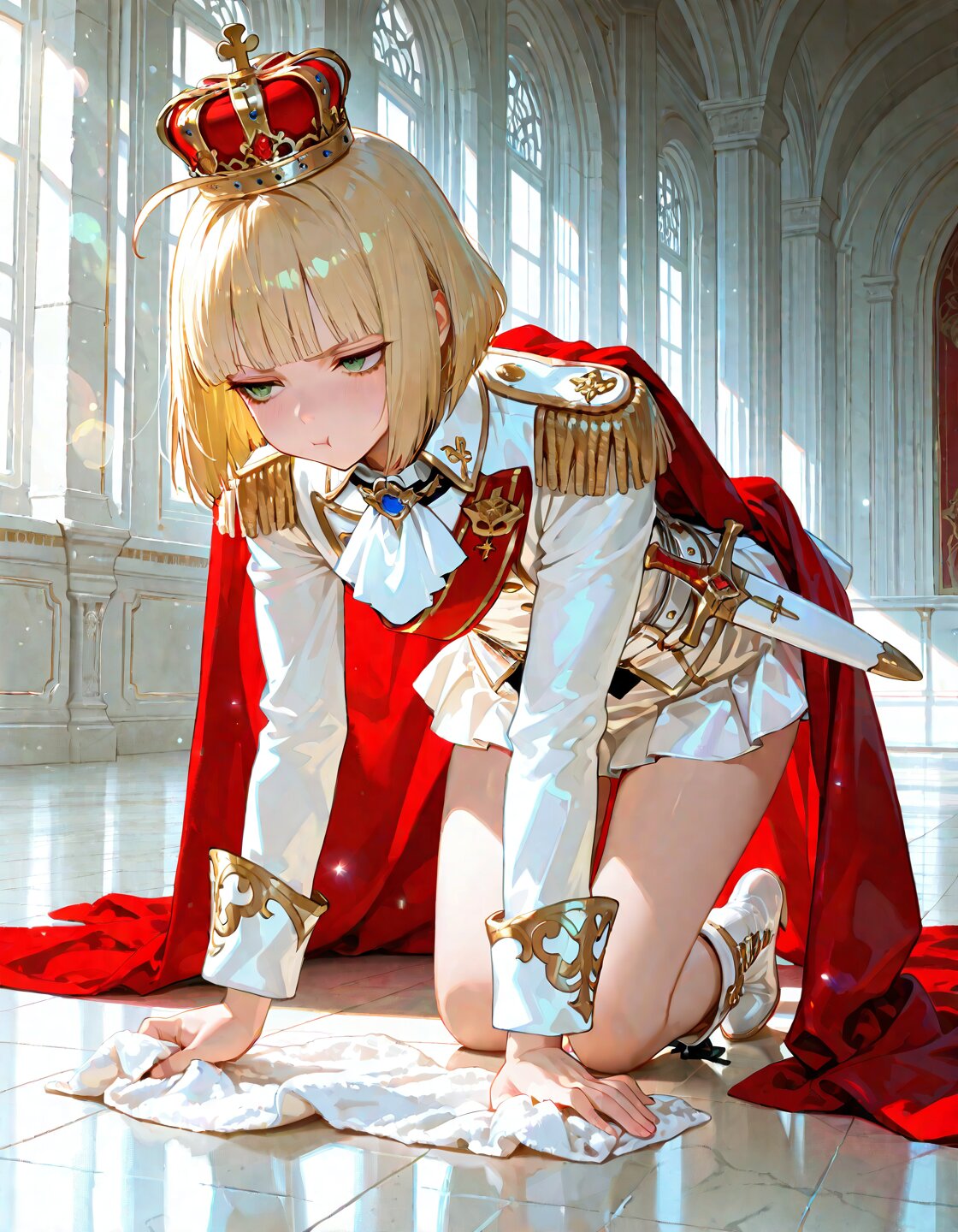 solo,1Boy,Blonde hair,Green eyes,blunt bangs,ahoge,short hair,straight hair,hime cut,delicate face,delicate hair,beautifully detailed hair,defined detailed face,beautiful detailed eyes,beautiful detailed eyes,masterpiece,best quality,insanely detailed,beautiful,16k,photorealistic,frustrated,pout,expressionless,jitome,Prince Charming,(White luxurious Prince costume:1.5),long sleeves,(Red luxurious Cape:1.3),epaulettes,(luxurious White mini skirt:1.3),(White luxurious boots:1.3),(dagger on waist:1.3),(luxurious crown on head:1.3),on all fours,(Wiping the Marble Floor:1.3),(with a wiping cloth:1.3), in the luxury room,Palace,Rococo architecture, light atmosphere,romantic academia,lens flare,shining lights,bloom,side view