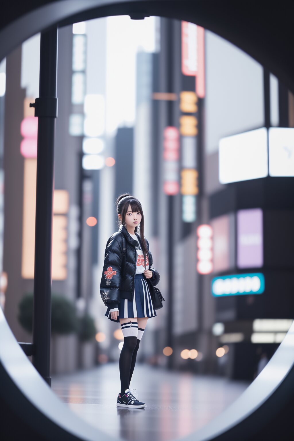masterpiece, hyper detailed, 8K, hyper detailed illustration, BREAK Japanese woman, 23yo, (cute:1.1), (pretty:1.1), hyper detailed face, hyper detailed eye, beautiful eye, medium hair,bangs, thin,tall, perfect anatomy, Pleated Skirts, High Socks, Sneakers, hyper detailed background, city background,hyper detailed, standing, on roof top.