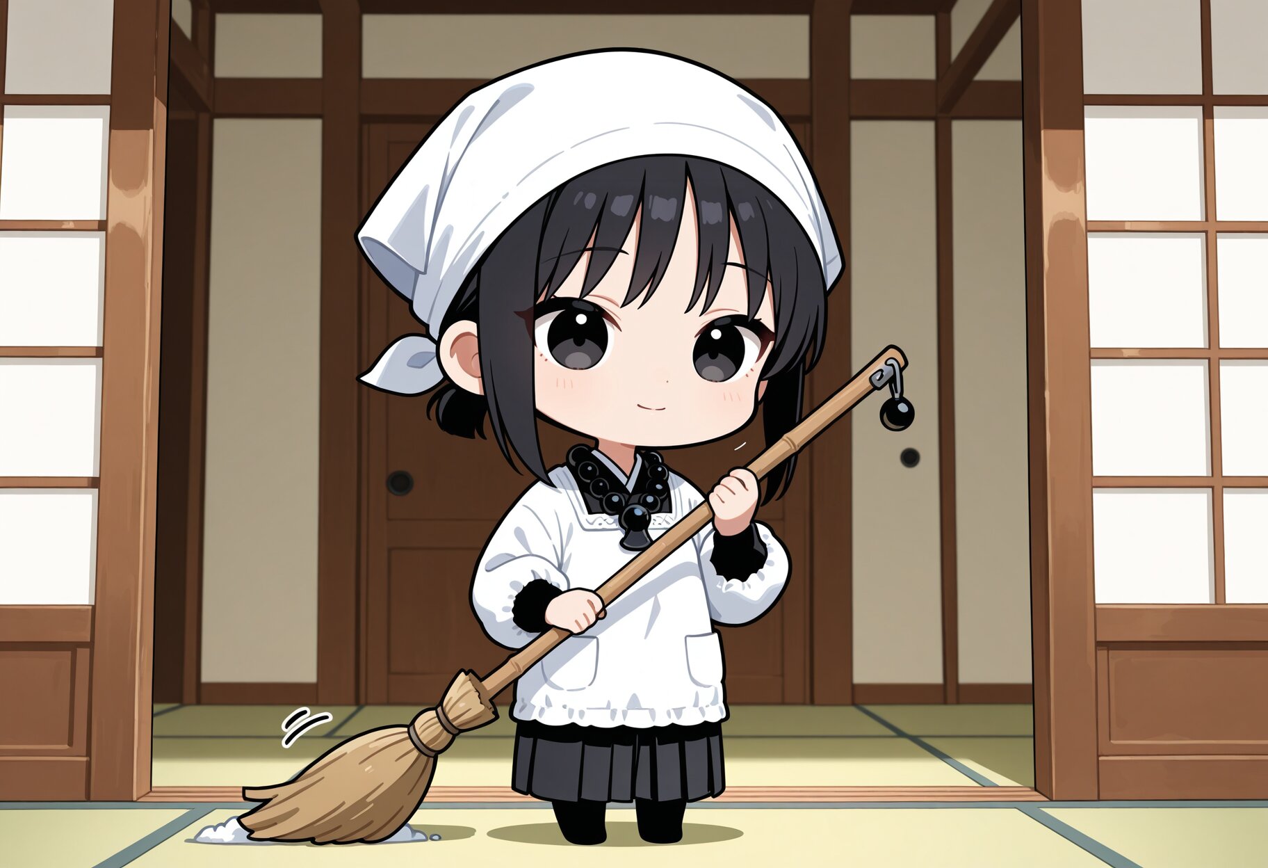 masterpiece,best quality,highres,ultra detailed,highly detailed,8k,general,chibi,1girl,solo,17yo,cute,(long sleeves,long black sleeves,black Buddhist prayer beads necklace,kappougi,chef bandana,holding broom),black hair,short hair,bangs,slender,small breasts,black eyes,light smile,closed mouth,japanese monk girl,(long kimono,black kimono,long black hakama),black socks,slender girl,full body,japanese temple,japanese room,fantasy,cleaning,motion lines,