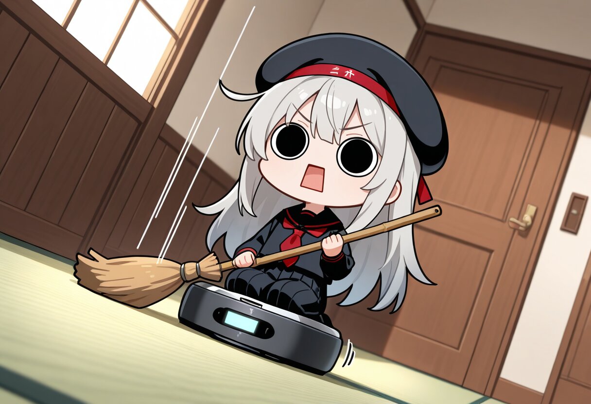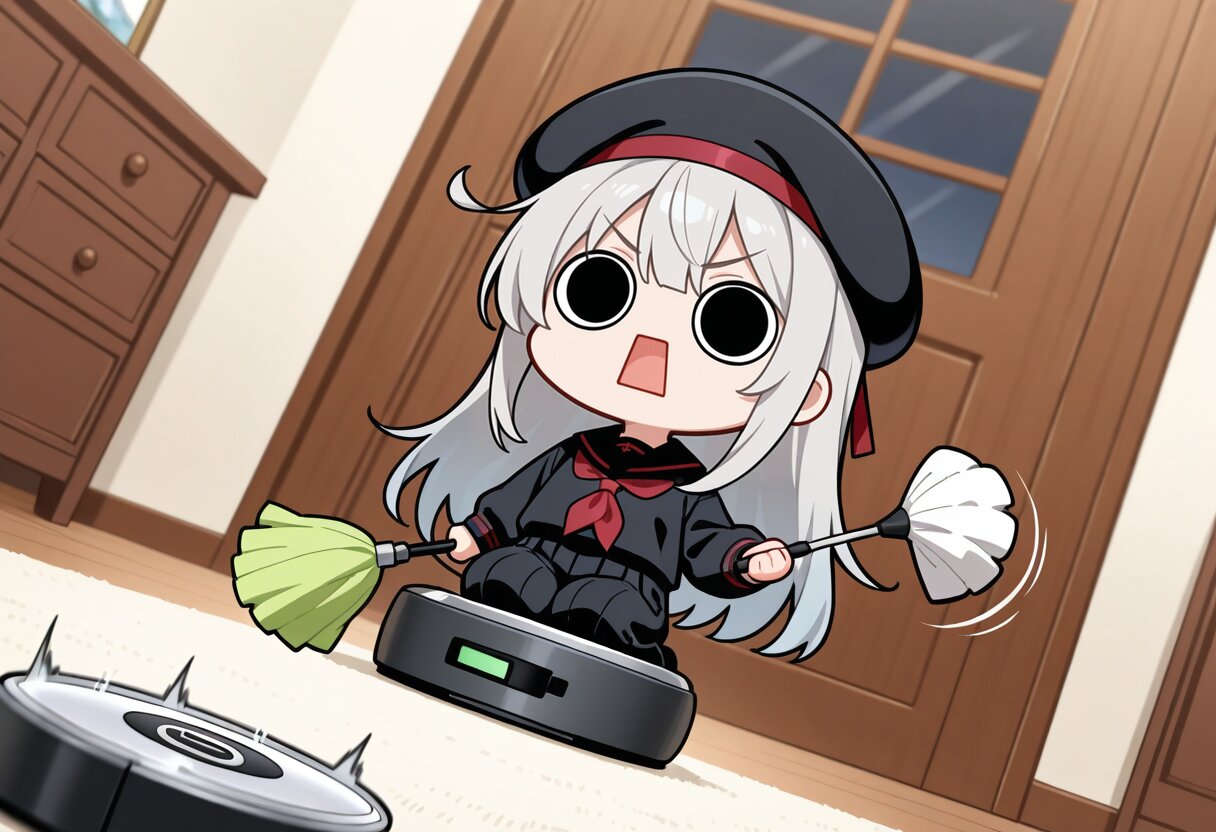 masterpiece,best quality,highres,ultra detailed,highly detailed,8k,general,(chibi:1.2),1girl,solo,<o> <o>,round eyes,round pupils,rectangular mouth,v-shaped eyebrows,grey hair,long hair,black hat,black beret,black serafuku,red part tie,long pants,shirt tucked in,(speed lines, motion lines, motion blur,seiza on huge robotic vacuum cleaner,holding duster:1.2),full body,dutch angle,looking at viewer,front view,in room,