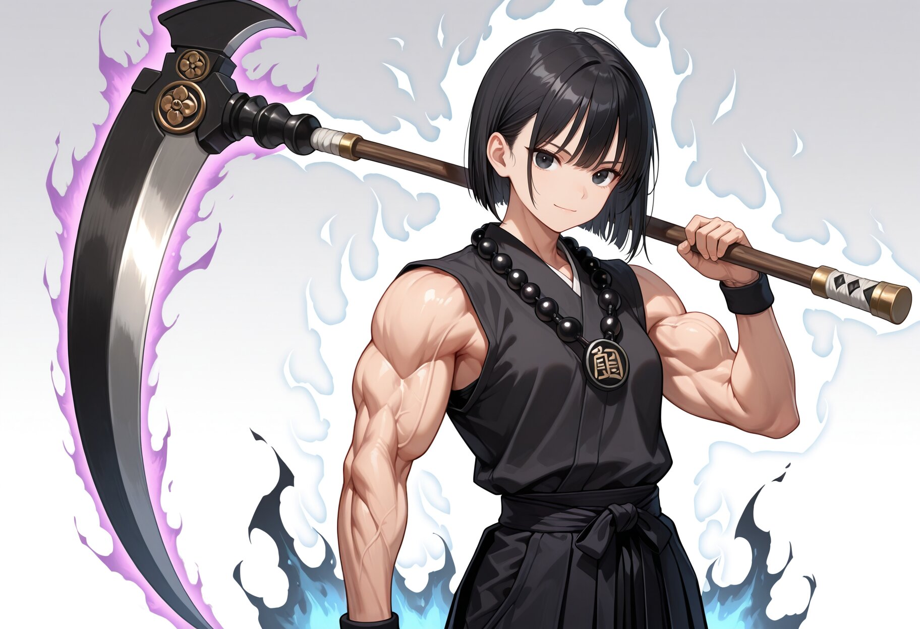 masterpiece,best quality,highres,ultra-detailed,highly detailed,general,1girl,solo,17yo,cute,(extreme muscular female,toned female,slender but muscular body,extremely defined muscular,(defined muscular arms:1.2),aura,black japanese clothes,holding Giant Scythe over shoulder:1.2),(black Buddhist prayer beads necklace,black hair,short hair,bangs,light smile),cute girl,slender,small breasts,black eyes,sleeveless,closed mouth,light smile,angry,monk girl,(very long karate gi,black inner shirt,black kimono,black sash,very long black hakama),slender girl,aura background,fantasy,medium hair,young,arm at side,