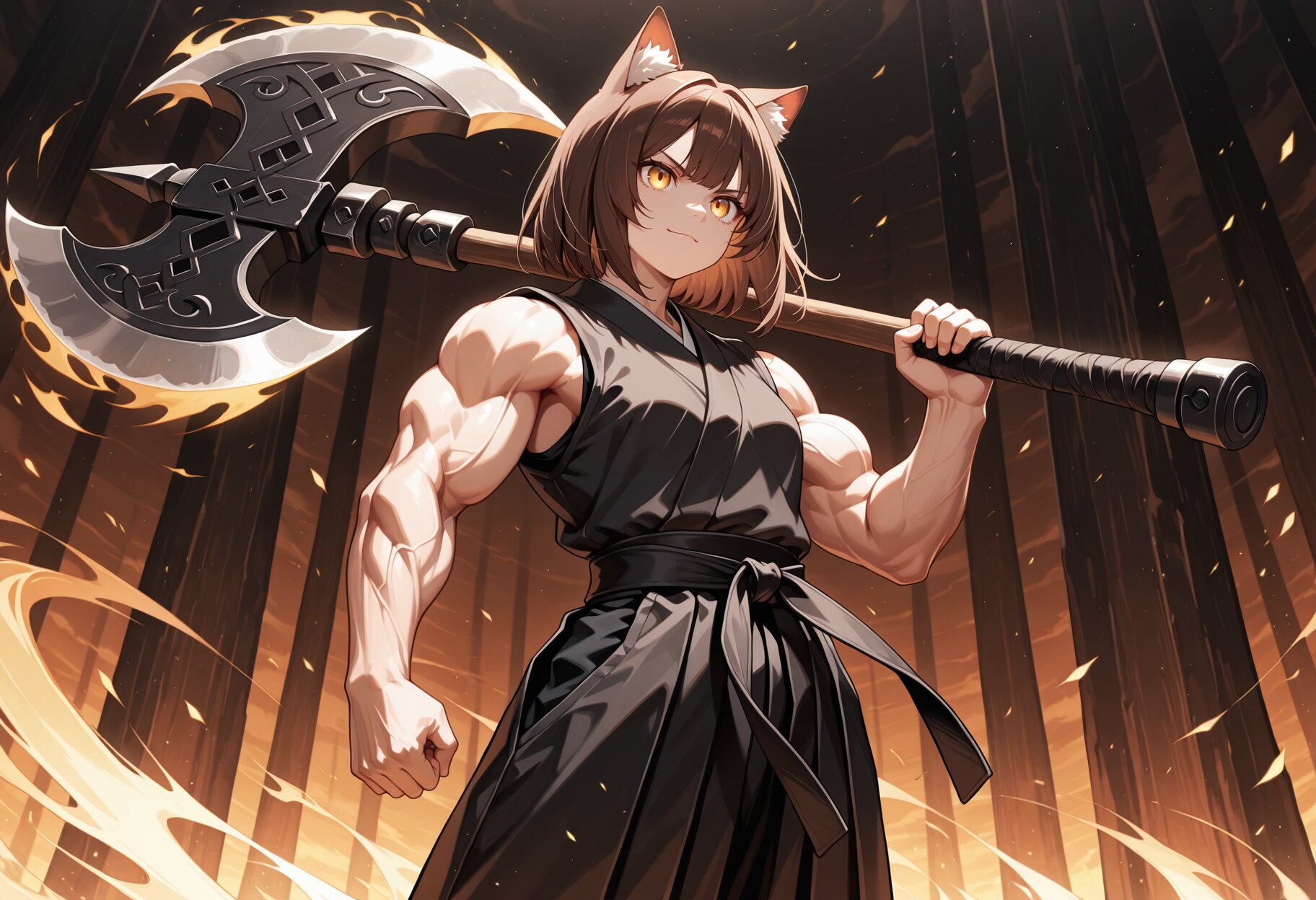 masterpiece,best quality,highres,highly detailed,detailed eyes,general,1girl,solo,17yo,cute,(extreme muscular female,toned female,slender but muscular body,extremely defined muscular,(defined muscular arms),holding very gigantic battle axe over shoulder,aura,black clothes),(cat ears,Brown hair, short hair,bangs,light smile,angry),golden eyes,slender,small breasts,sleeveless,closed mouth,cat girl,(black japanese clothes,very long karate gi,black inner shirt,black kimono,black sash,very long black hakama),slender girl,fantasy,arm at side,medium hair,