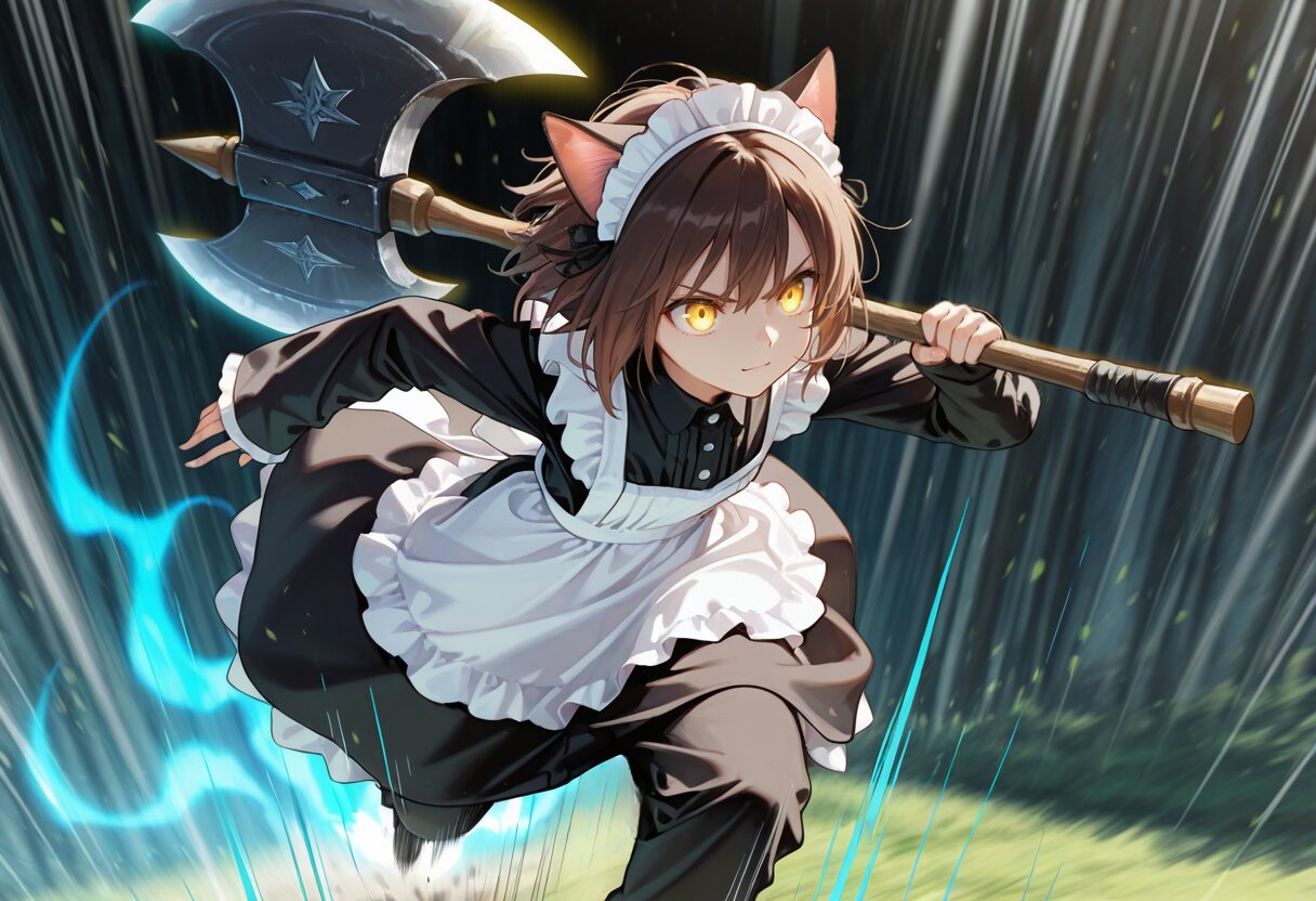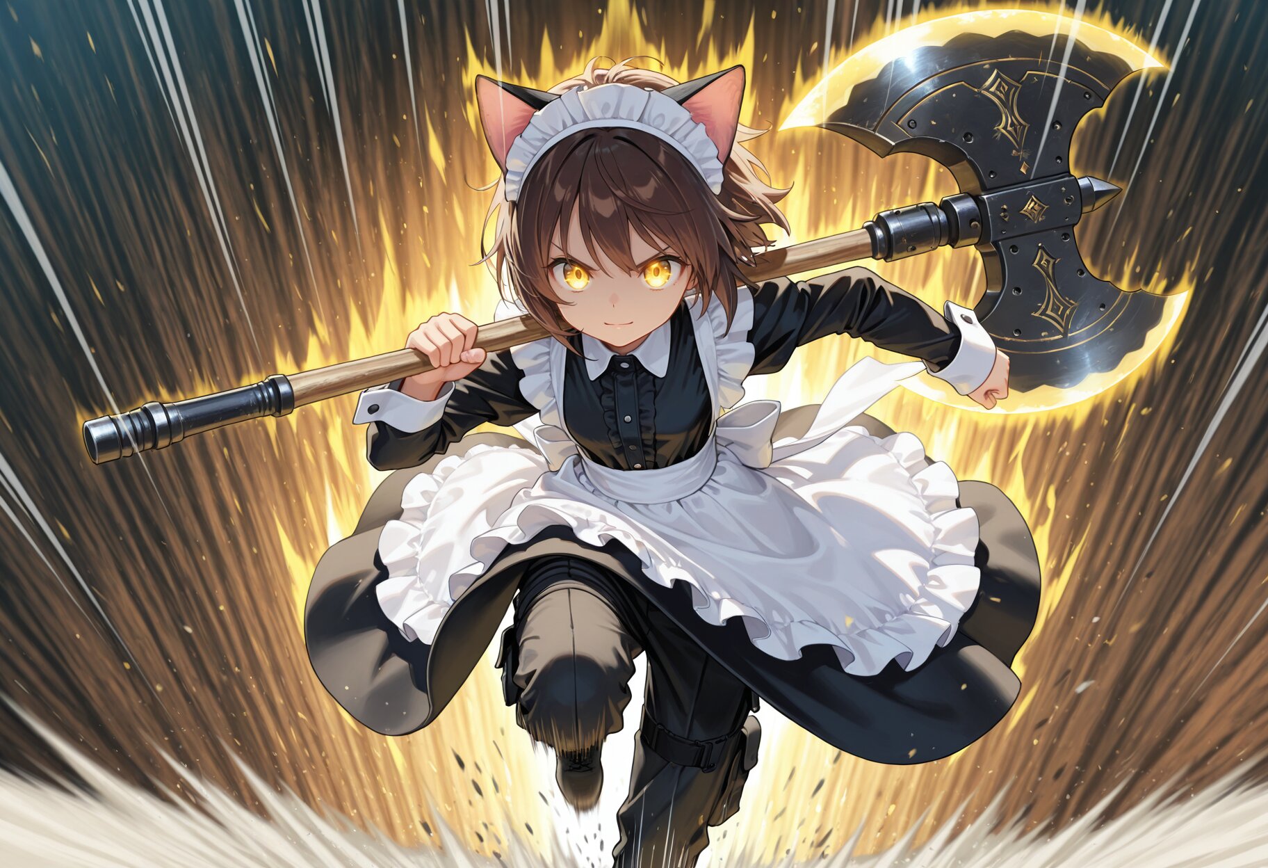 masterpiece,best quality,highres,ultra detailed,highly detailed,8k,general,front view,1girl,solo,17yo,cute,(holding a very gigantic mechanical battle axe over shoulder,running,jumping,motion lines,motion blur,speed lines,aura:1.4),(long sleeves that cover wrists,brown hair, short hair, cat ears, golden eyes,glowing eyes),slender,small breasts,light smile,angry,closed mouth,(highneck black blouse, maid,white maid headdress,long white maid apron,very long maid skirt,long black cargo pants),boots,slender girl,fantasy,cowboy shot,