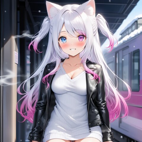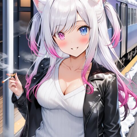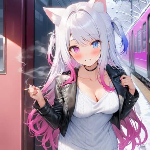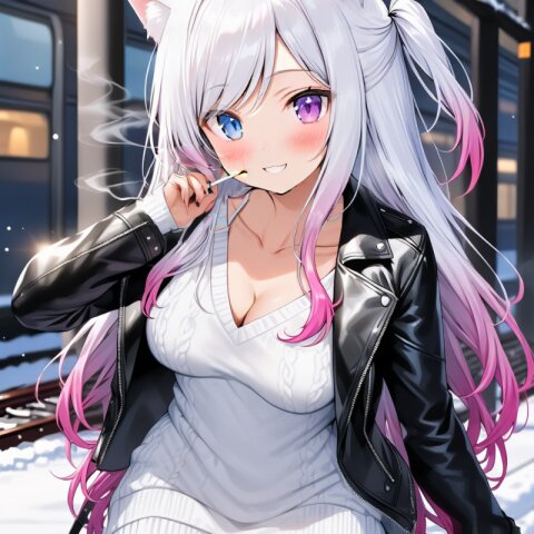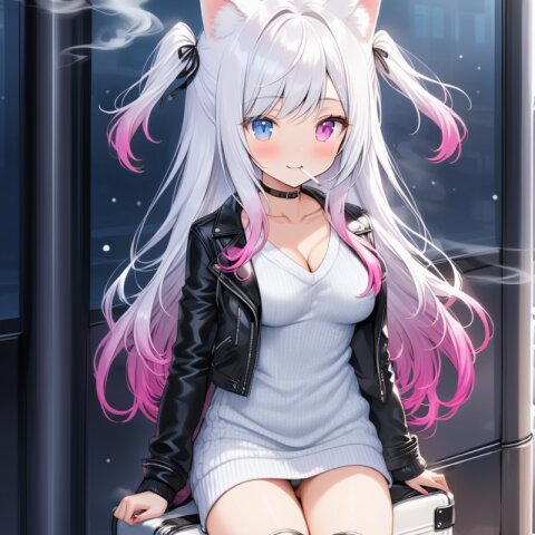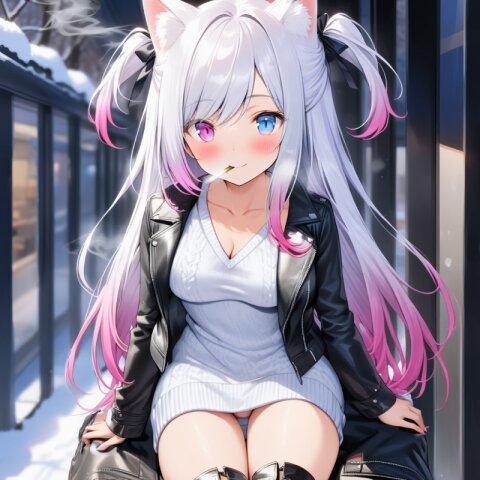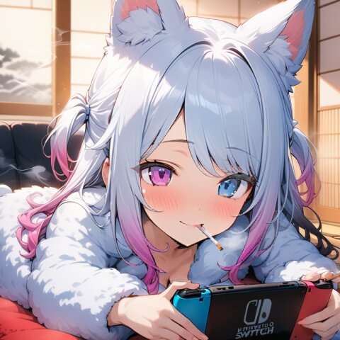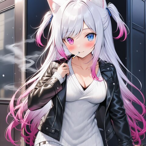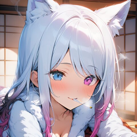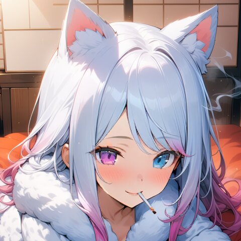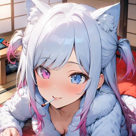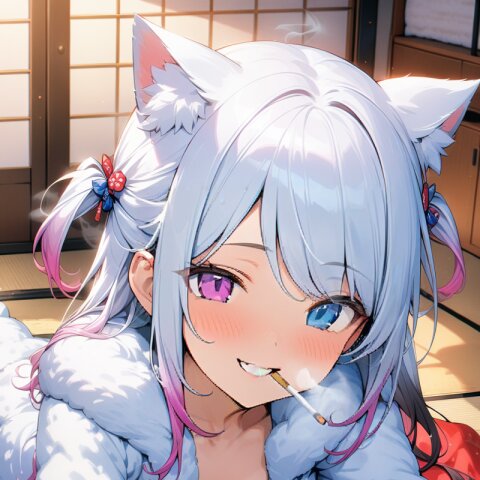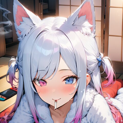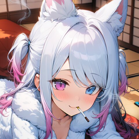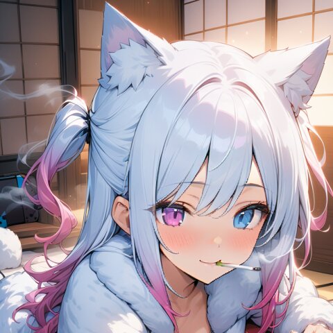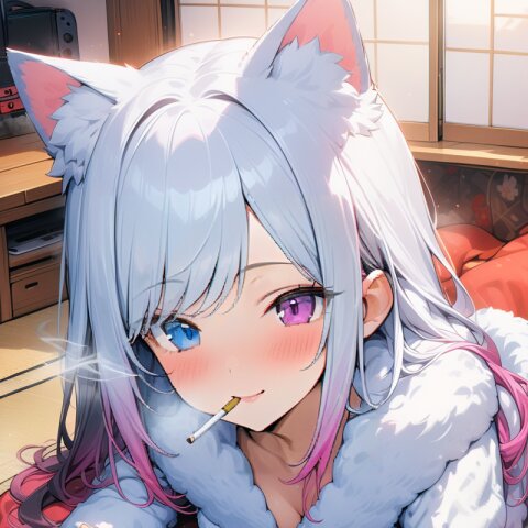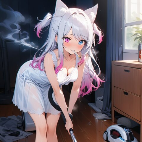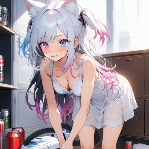 (full body:1.5), ((8k, masterpiece ,best quality ,ultra-detailed)), game cg, masterpiece, (perfect face:1.5), (perfect hands:1.5), (perfect legs:1.5), (perfect arms:1.5), (perfect fingers:1.5), (1girl:1.4), solo, (cleaning room:1.2, vacuuming wooden floor, hold the vacuum cleaner hose:1.3), (beer can:1.3), ((smoking, holding cigarette):1.4), BREAK (white hair:1.4), (gradient hair white to dark pink:1.4), (long straight hair:1.4), (long two side up:1.3), (swept bangs:1.2), (cat ears:1.3), (heterochromia:1.3, purple eyes, blue eyes), japanese_girl, (medium breasts:1.2), (glamor:1.3), (gleaming skin:1.4), (smile:1.3), blush, BREAK (white theme:1.4), ((triangle line, A-line):1.2), (sleeveless white loose nightdress with plunking neckline:1.4), (white silk fabric:1.3), (collarbone:1.3), ((bare legs, bare feet):1.3), <lora:xl_more_art-full_v1:0.6> <lora:add-detail-xl:1>,