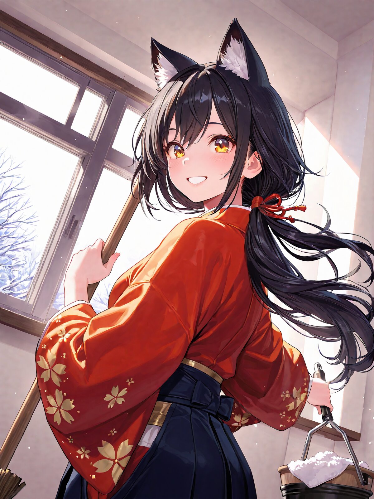 Year-end, spring cleaning, broom, winter fashion, window, gold amber eyes, low ponytail, black hair, cat ears, hakama, dynamic angle, smile, grin