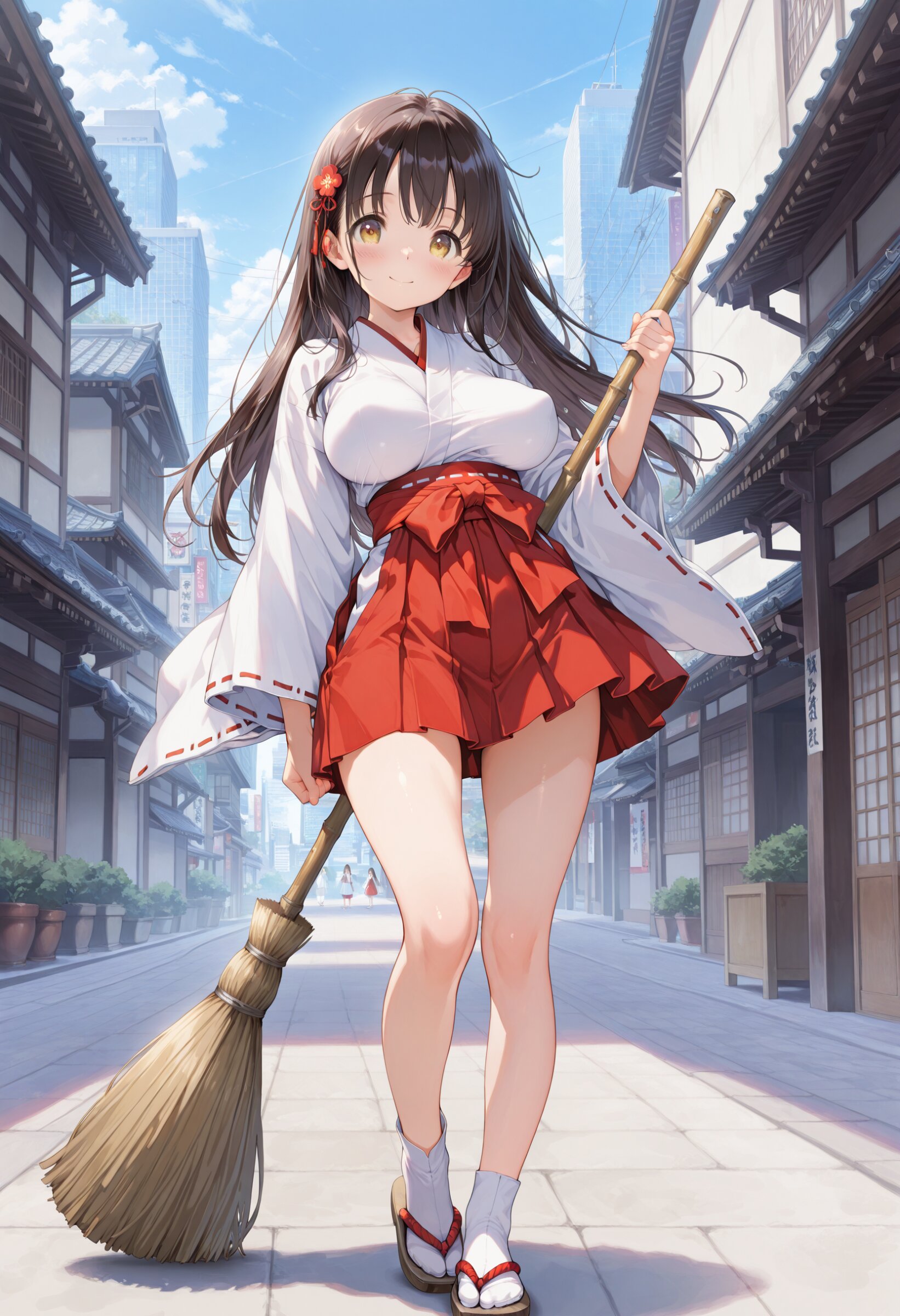 masterpiece, best quality, amazing quality, general, fine detail, official art, 1girl, loli, petite, beautiful hair, beautiful eyes, miko, miniskirt, beautiful legs, big breasts, impossible clothes, (perky breasts:1.2), innocent expression, , Urban city square, Holding a broom and taking a defensive stance, dynamic pose, happy,