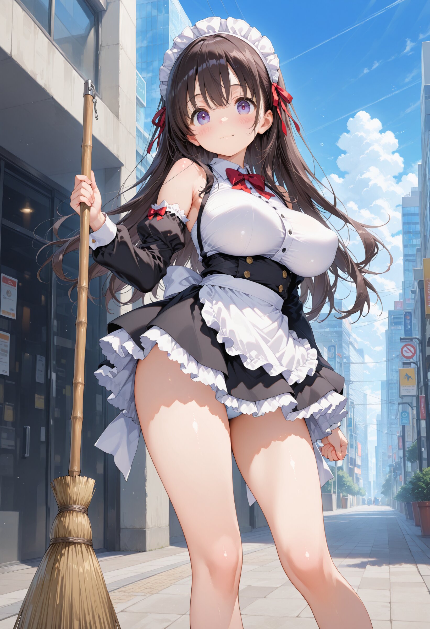 masterpiece, best quality, amazing quality, general, fine detail, official art, 1girl, loli, petite, beautiful hair, beautiful eyes, white maid uniform, detached black sleeves, bare shoulders, white waist apron, miniskirt, beautiful legs, big breasts, impossible clothes, (perky breasts:1.2), innocent expression, , Urban city square, Holding a broom and taking a defensive stance, happy,