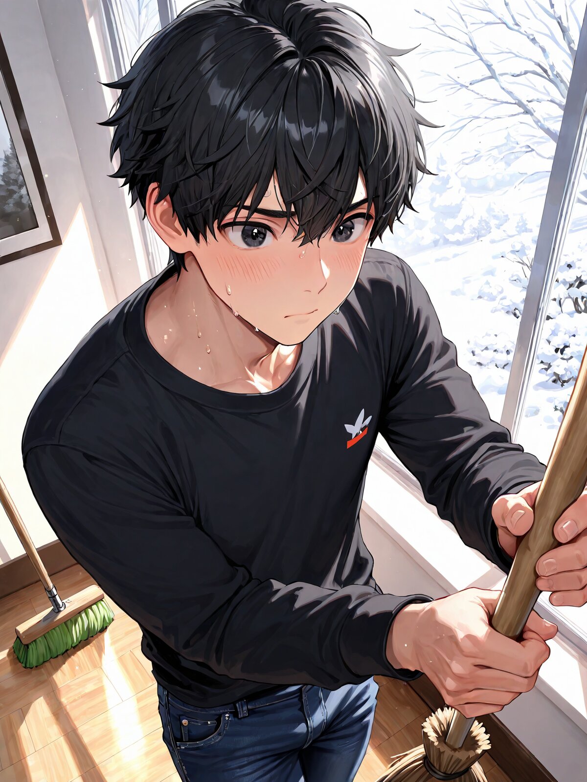 male focus, solo, Year-end, spring cleaning, broom, winter fashion, boy, short hair, Black hair, Black eyes, Black shirt, denim pants, dislike, sweat,