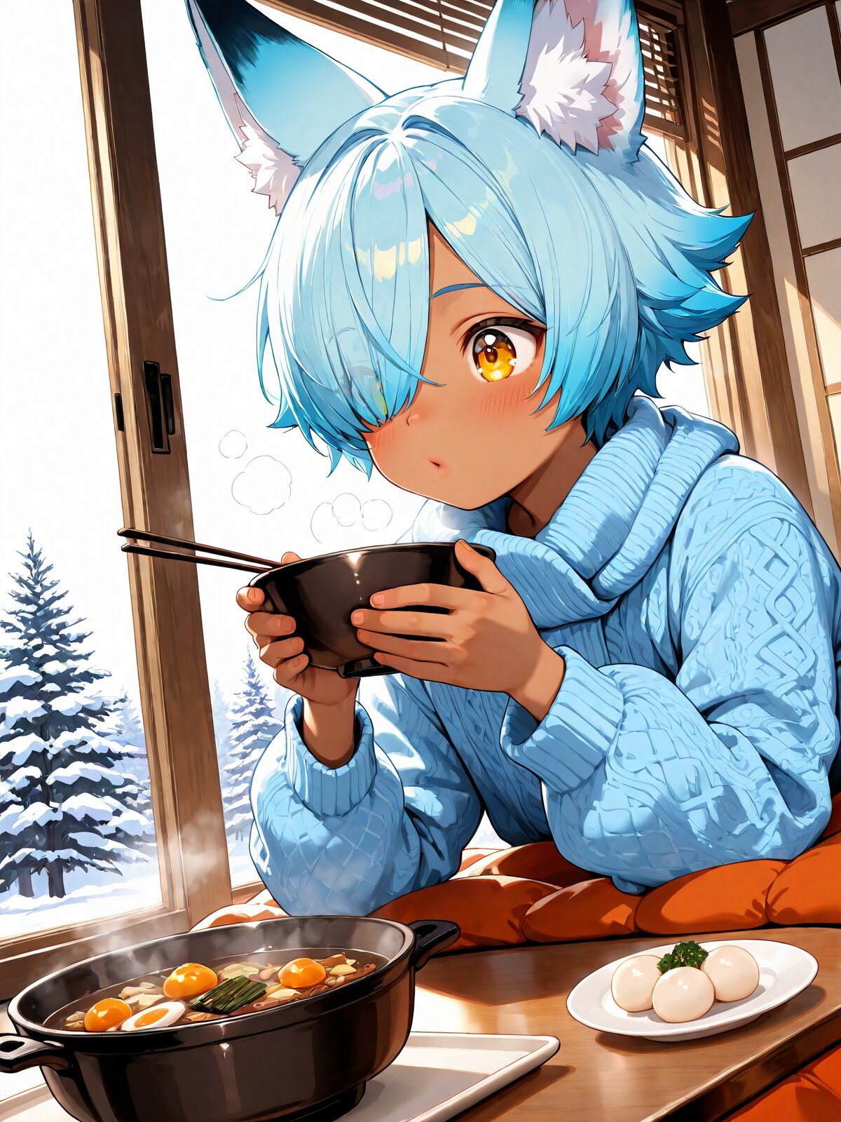 solo, winter fashion, dining, window, Hot pot dishes, kotatsu, male focus, boy, shota, fox ears, golden amber eyes, bright sky blue hair, tan skin, hair over one eye, short flipped hair,