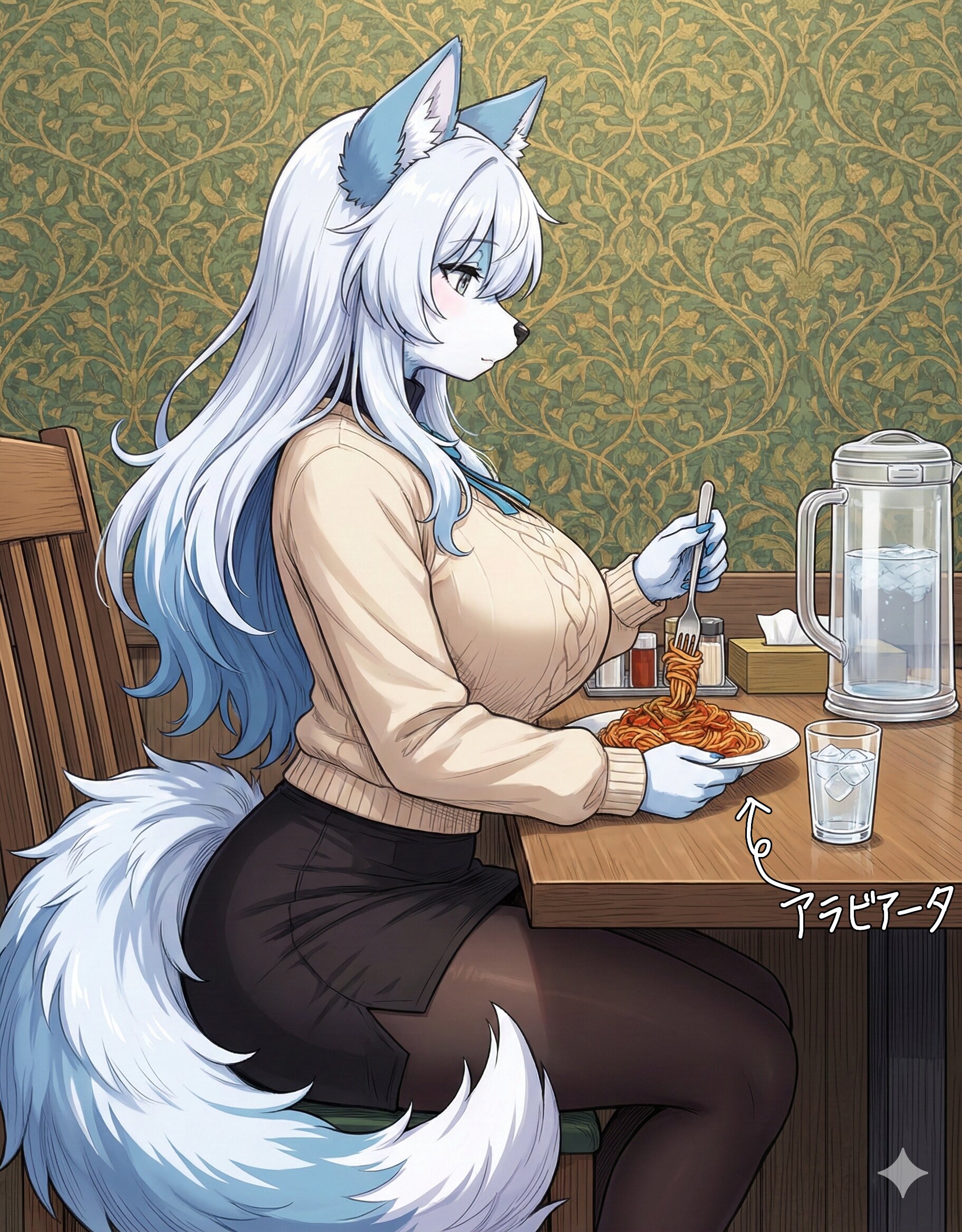 イラストのキャラクターをGペンでペン入れする。2D。カラー。強めの影とコントラスト。線は細く薄くする。バストとヒップがとても豊満。参照イラストのキャラクターをそのまま使ってポーズを変更。毛並みはモフモフ。背景は緑色かつ金色の蔓の模様。キャラクターを側面から見る。キャラクターがフォークを使い、アラビアータのパスタを巻いているイラスト生成。パスタを載せた白い皿が木製のテーブルに置いてある。食器の隣に氷水が入ったガラスのコップ。食器の隣に調味料、ティッシュ箱、水差しが置いている。グラデーションを追加。 ▶︎ 毛並みはモフモフ。水差しは蓋が付いている。