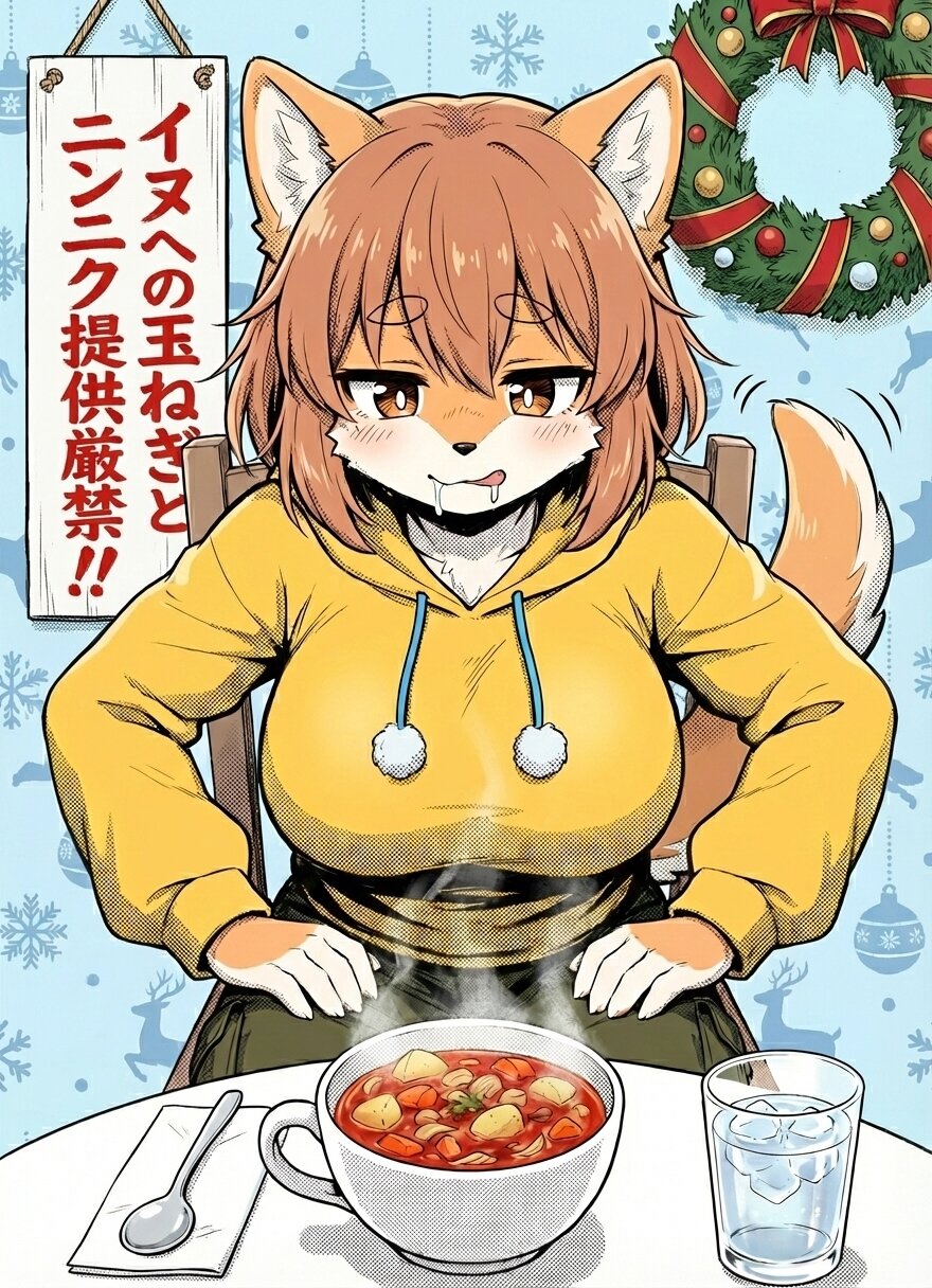 イラストのキャラクターをGペンでペン入れする。2D。カラー。濃いトーンを貼っている。強めの影とコントラスト。線は細く薄くする。バストがとても豊満。帽子を外している。参照イラストのキャラクターをそのまま使ってポーズを変更。毛並みはモフモフ。背景は水色で、クリスマスのリースが飾られている。キャラクターを真正面から見る。キャラクターが前方のミネストローネを涎を垂らしながら見下ろすイラスト生成。キャラクターは手を膝に置いて椅子に座っている。食器は白いスープカップで、手前の白いテーブルに置いてある。ジャガイモ、ニンジン、タマネギ、キャベツが入っている朱色のミネストローネ。湯気が立っているミネストローネ。食器の隣に氷水が入ったガラスのコップ。グラデーションを追加。 ▶︎ 背景を水色のクリスマス柄に変更。柴犬の耳と尻尾であり、丸まった尻尾を振っている。食器の隣に紙ナプキン、その上にスプーン。 ▶︎ 背景に白い縦看板が掛けられており、赤色の墨で「イヌへの玉ねぎとニンニク提供厳禁‼︎」と書く。
