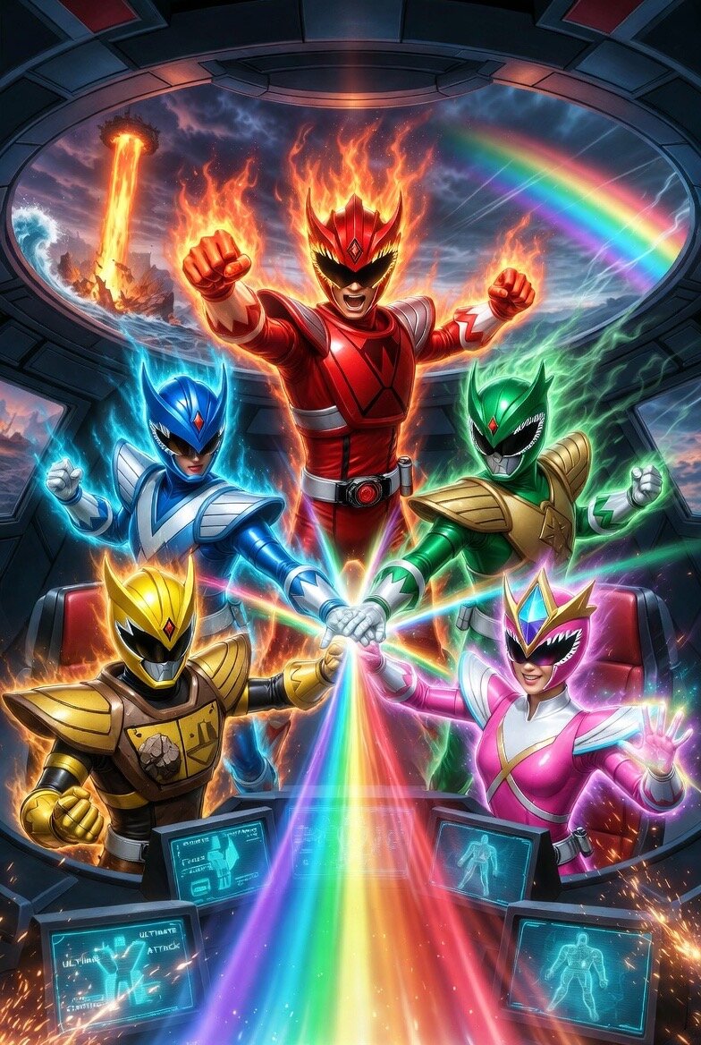 Dynamic anime-style illustration of five elemental super sentai heroes inside a high-tech giant robot cockpit, activating their ultimate finisher attack "Element Union Wave". The team in circular formation: - Red Ranger (fire leader, hot-blooded male, central forward position, both fists thrust forward emitting intense red flames and fireballs, confident shouting expression) - Blue Ranger (water strategist, calm female, elegant circular arm motions with flowing blue water waves and droplets) - Yellow Ranger (earth tank, strong male, wide stance stomping ground, arms crossed with yellow rock and earth aura cracking) - Green Ranger (wind speedster, agile male, leaning forward dynamically with green wind swirls and hair/mantle blowing) - Pink Ranger (light support, gentle female, arms spread wide emitting rainbow light particles and glow, smiling softly) All standing from seats, hands stacked together in the center sharing energy, colorful elemental auras (red fire, blue water, yellow earth, green wind, pink light) connecting via glowing lines and merging into a massive rainbow energy sword/wave charging in front. Cockpit details: circular high-tech interior with hologram screens showing giant enemy silhouette and "ULTIMATE ATTACK CHARGING" text, sparks flying from vibration, dramatic lighting with energy glows. Outside windows: stormy sky with fire pillars, waves, earthquakes, wind gusts, and rainbow light. Epic heroic atmosphere, detailed colorful suits with elemental motifs on helmets and armor (flame horns, wave crests, mountain shapes, wing patterns, prism crown), vibrant colors, high detail, cinematic composition, super sentai style like Power Rangers or Kyuranger --ar 16:9 --v 5 --q 2