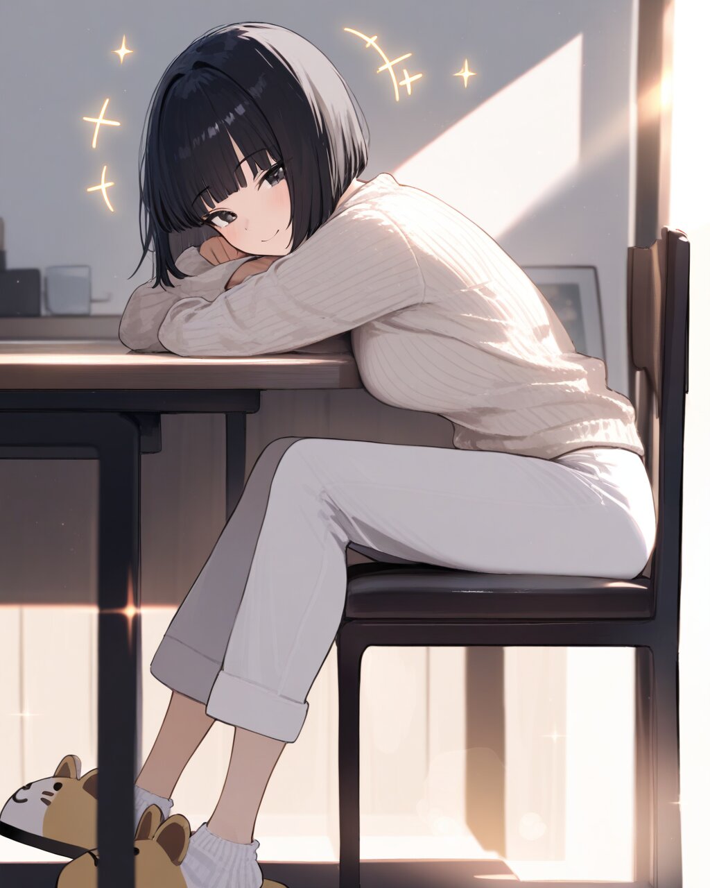 1girl, black straight bob cut, black eyes, ribbed sweater, white pants, ankle socks, animal slippers, smile, from side, sitting on the chair, head rest on table, sunlight, sunny spot, sparkling aura, +++, masterpiece, absurdres, high score, great score