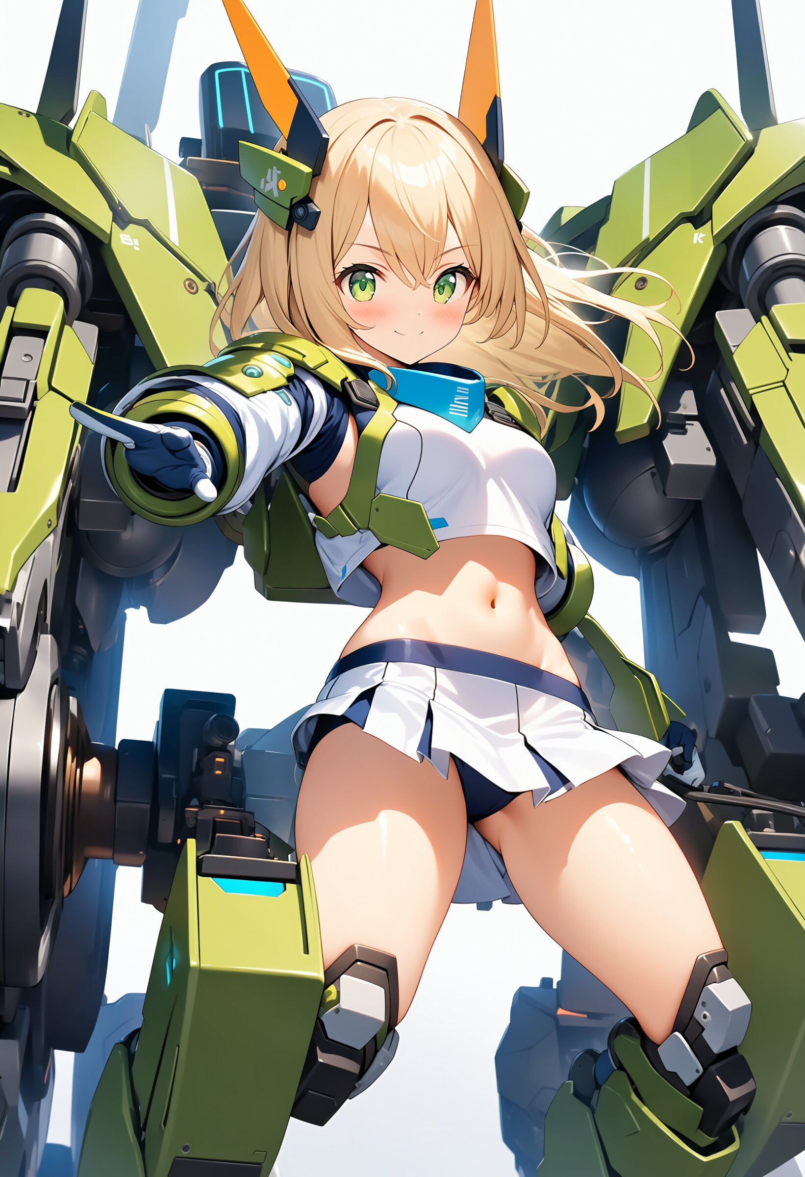 1girl, ((white background)), ultra detailed 8k cg render, masterpiece, high resolution, extremely detailed, mecha musume,mecha shoulder, mech leg, headgear, mecha armor, ((mini skirt)),long blonde hair, dropping green eyes, smile, dynamic posing,
