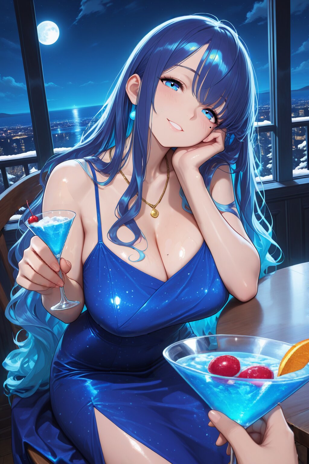 1 girl, bar,window,(night:1.3),moon,night view,snow, slender face,slender,(shiny skin),tall, huge breast, (navy and cerulean multicoloerd hair:1.3),(very long straight hair:1.3),(sidelocks),center flap bangs, (wavy hair:1.3),(inward curl hair:1.3),((hair on chest:1.3)), (glowing blue eyes:1.3),(narrow eyes:1.3),(tareme:1.3),(sleepy eyes),(mole under eye:1.3), seductive smile,chuckle, shiny party dresses,slit,gold necklace, head tilt,hands on cheek, (holding red cocktail:1.3),(cheers:1.5), sitting on chair,gorgeous food on table, cowboy shot,dynamic angle,looking at viewer,from side:0.8, ((best quality)),amazing quality,((very high resolution)),very aesthetic,((ultra detailed)),absurdres, full color,extremely detailed CG,super fine illustration, perfect anatomy,perfect hands,super detailed skin, (beautiful eyes,detailed eyes,perfect eyes,eye reflection),high-quality face,extremely detailed face, anime style,