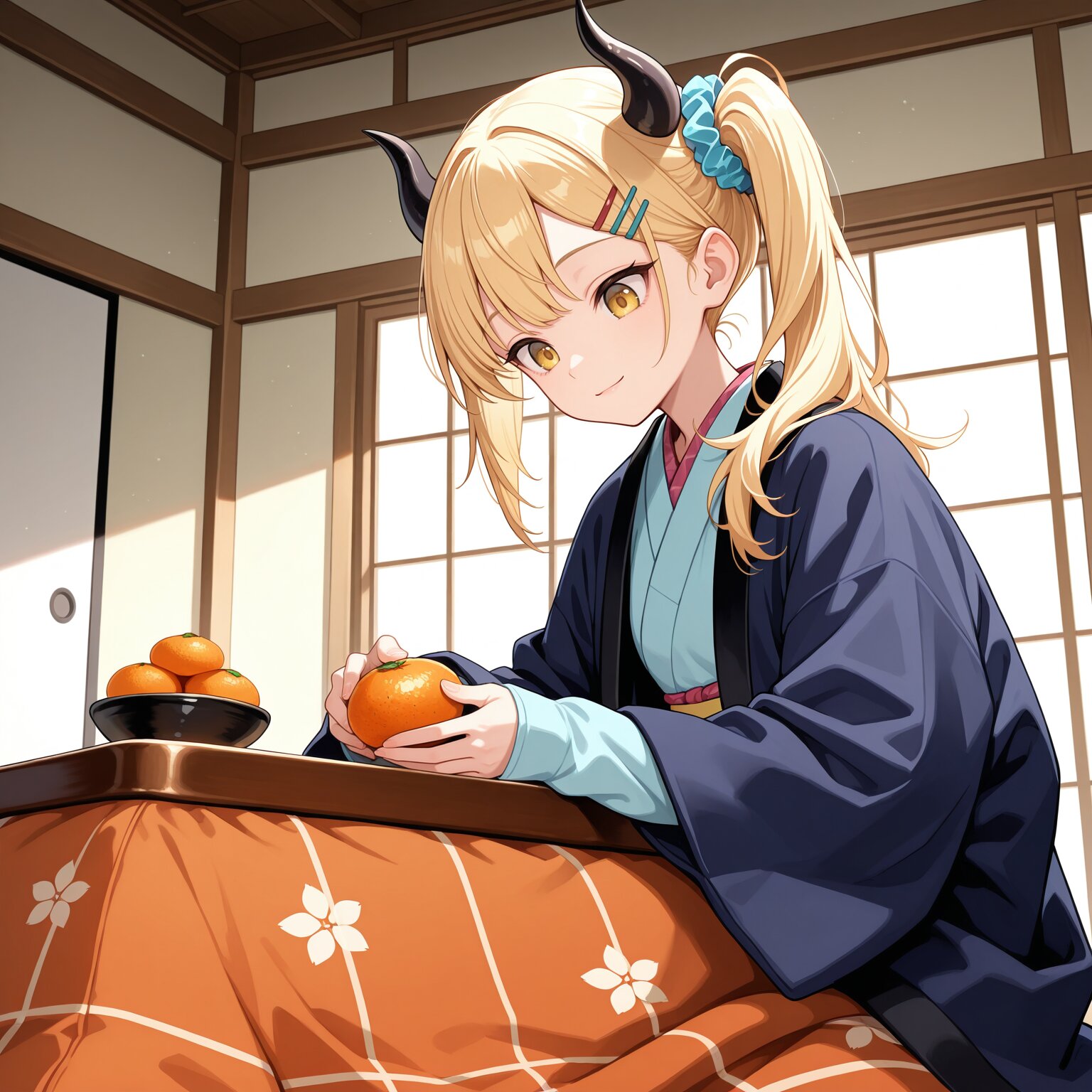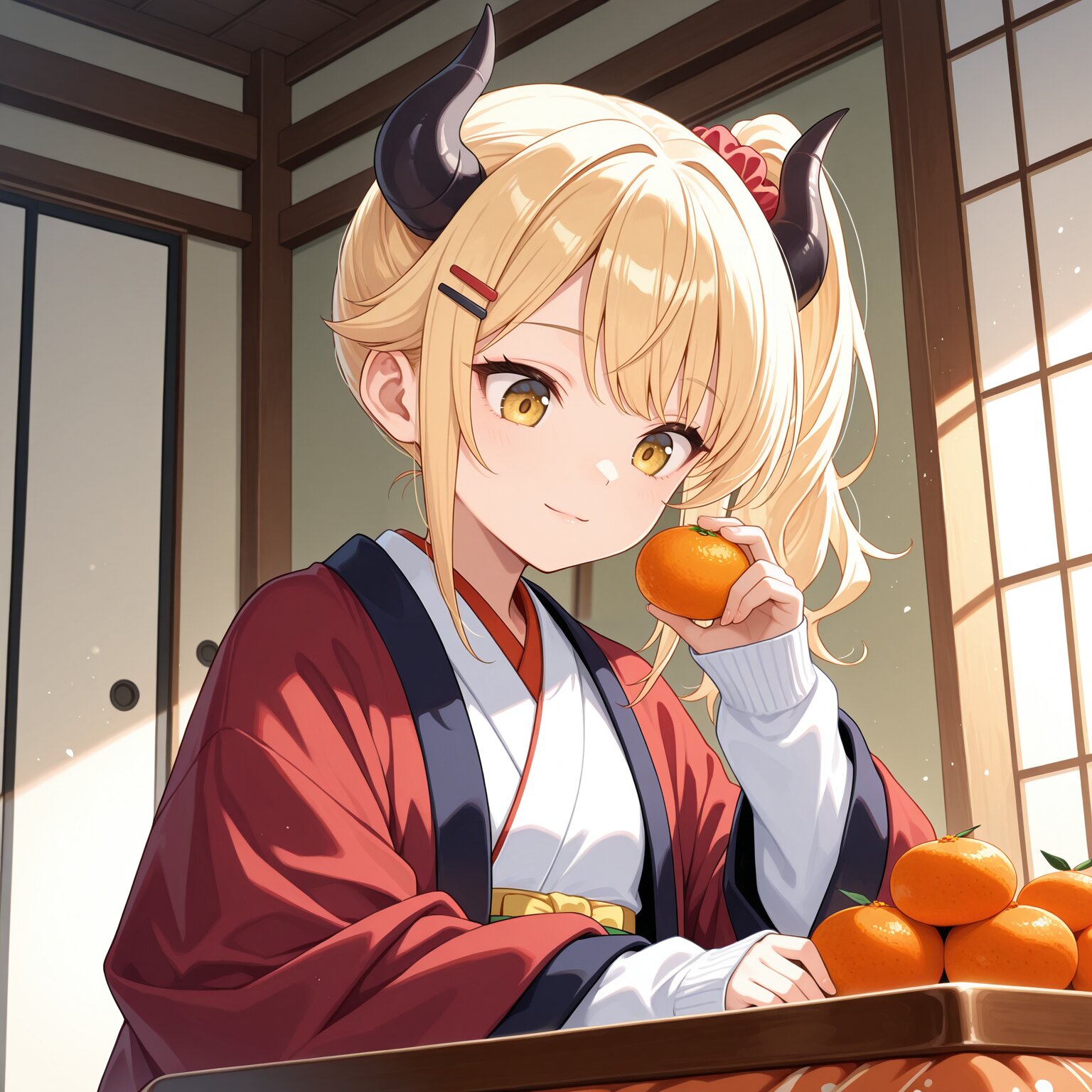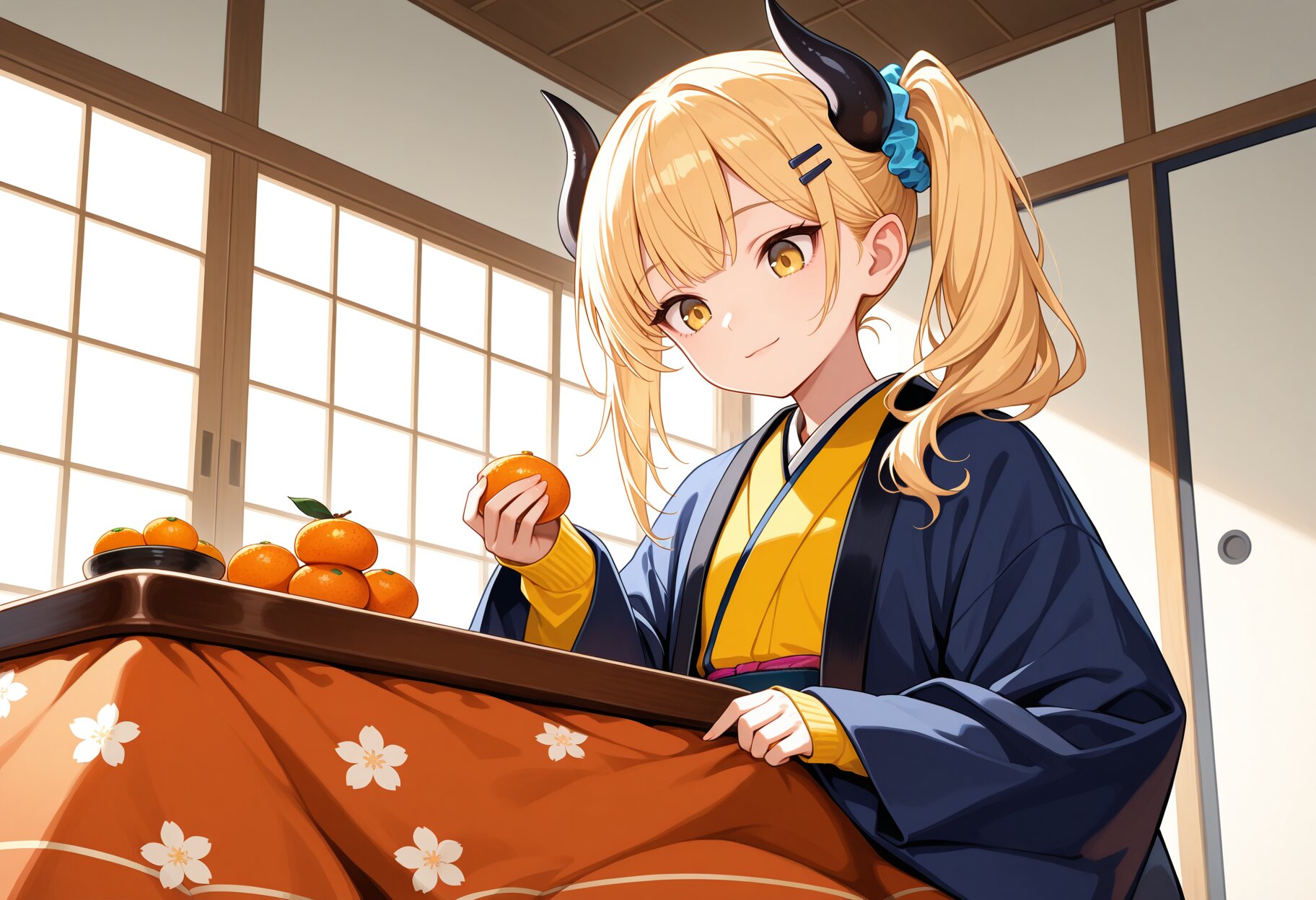 masterpiece,best quality,highres,ultra detailed,highly detailed,8k,general,1girl,solo,17yo,cute,(two demon horns,black horns,side ponytail,holding mandarin orange),small breasts,long sleeves,blonde hair,long hair,bangs,hair scrunchie,hairclip,yellow eyes,light smile,closed mouth,demon girl,(long hanten \(clothes\),kimono,sleeves past wrists),slender girl,sitting,mandarin orange on kotatsu,looking down,japanese room,fantasy,