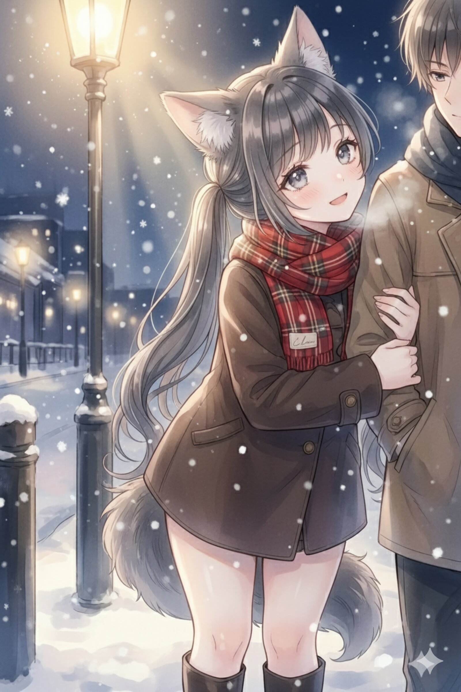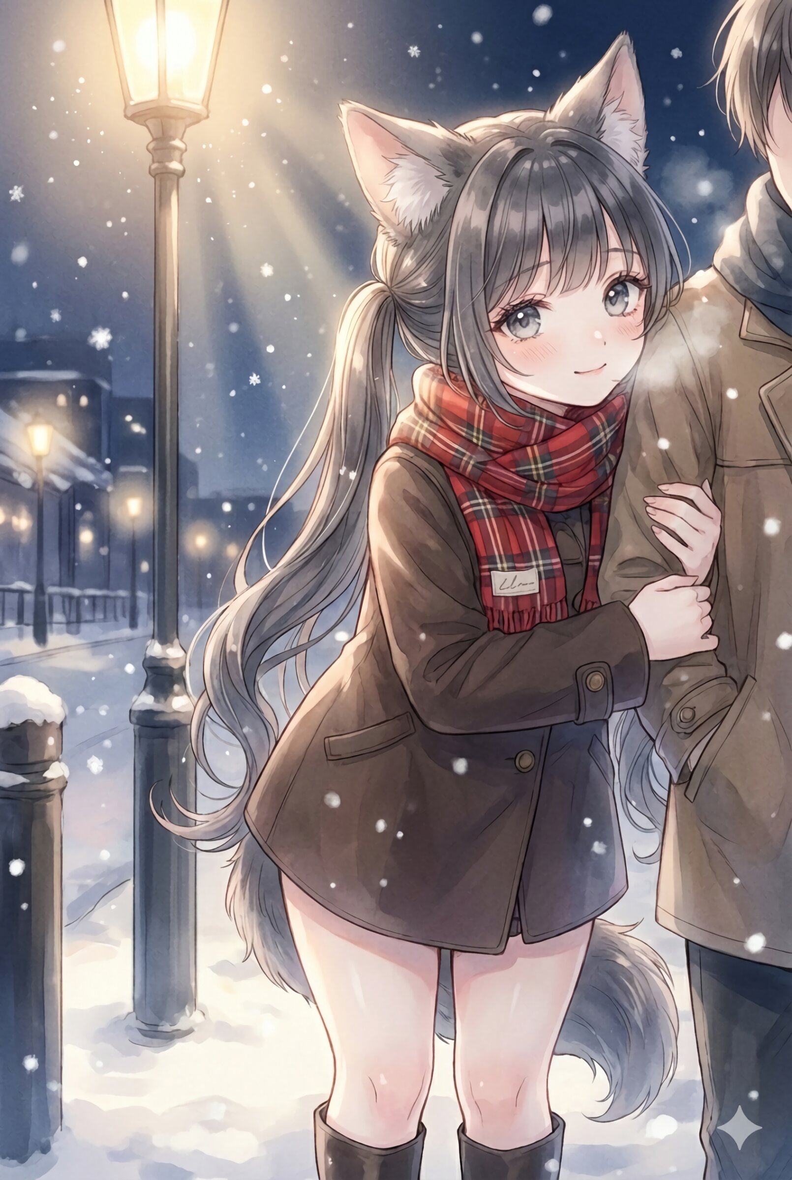 キャラは用意しています。女性の年齢は若年成人。 猫耳族の女の子なので、人間の耳は表示しないようにお願いします。 雪が降る夜、街灯の下で彼氏に甘えている可愛らしい表情で楽しそうにしている。 街灯優しい光が女性を幻想的に、美しく照らす。 (女性の特徴) 下まつげ強調。 モデルのような透明感のある美人。 優美で、穏やかな、静謐。 高精細。アニメ風。 **極度に繊細な線画,細い線** **柔らかな陰影,非常に綿密な,複雑なディティール** **淡い水彩,透明感のある水彩,柔らかな水彩** (masterpiece,best quality:1.4)、高解像度。 リムライト。ボリュメトリックライティング。 背景は街灯の下で照らされている。