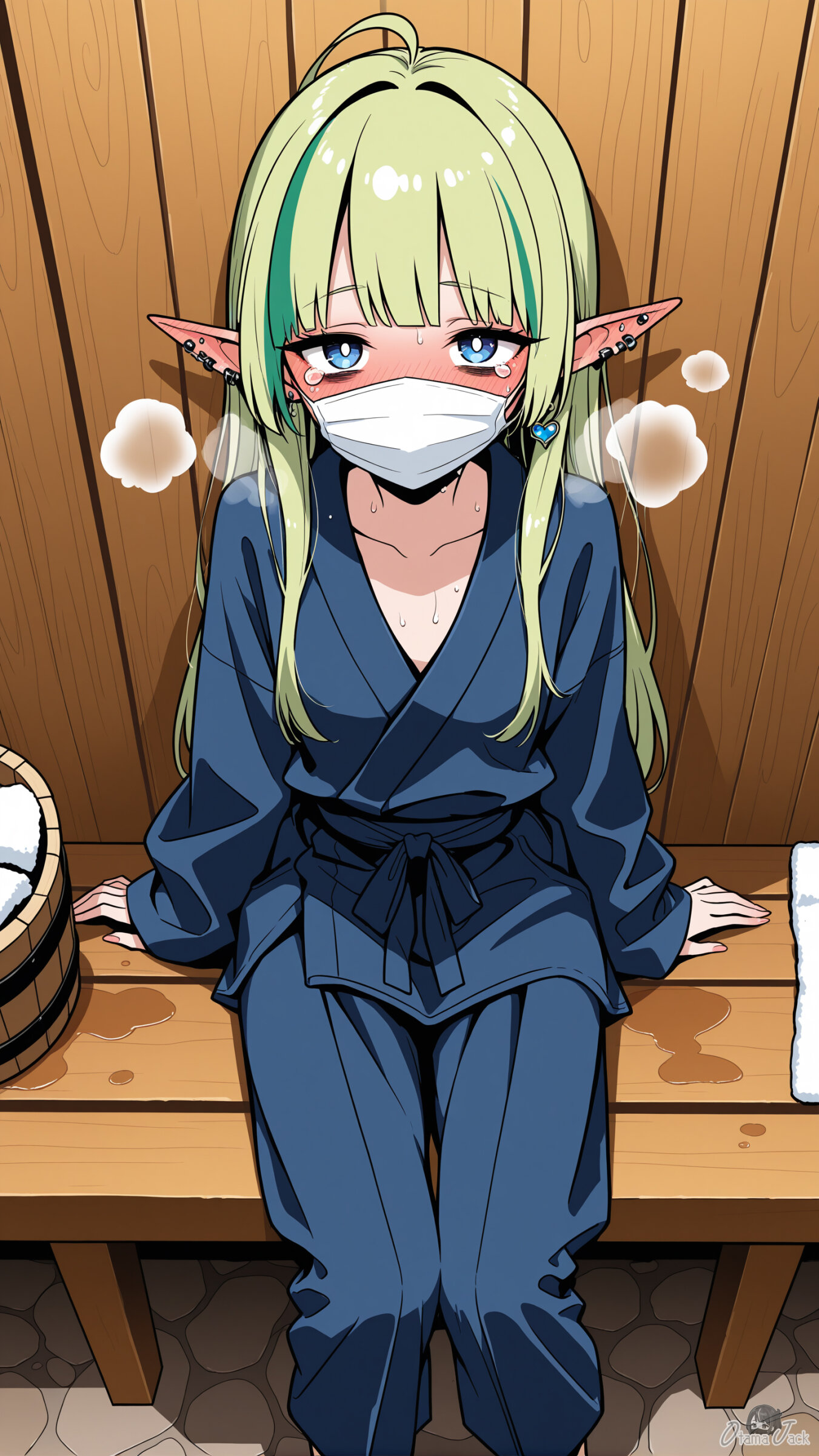 Samue,Japanese Workwear,Samue pants, blushing, nervous, wet, sweat, hot breath, sticky, steam, dazed, tears in eyes, blushing, embarrassed, happy, drooling, BREAK indoors, sauna, towel, scenery, wooden bucket, bench, wood, crate, brick wall, (Steam, heat, sweat, sitting,Steam all over the screen:1.2),