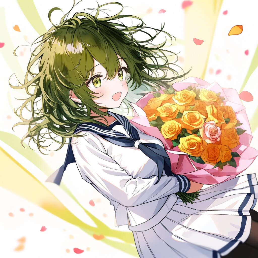 best quality,absurdres,8k,ultra detailed,very aesthetic,1girl,(rating: general:1.2), (messy hair:1.5), medium hair, olive-green hair, large expressive yellow-green eyes, flushed cheeks, slightly open mouth, medium breasts, hair between eyes, (beautiful eyes), {{{holding a bouquet of roses}}}, open mouth, {{{{school uniform}}}}, (navy sailor school uniform:1.5), serafuku, long sleeves, white shirt, pleated skirt, dark blue sailor collar, dark blue neckerchief, sailor collar, white skirt, pleated skirt, black pantyhose, black socks, brown loafers, solo focus, {watercolor style, beautiful woman's upper body}, smiling sideways, fluttering pink petals, {wind}, best quality, amazing quality, very aesthetic, absurdres,