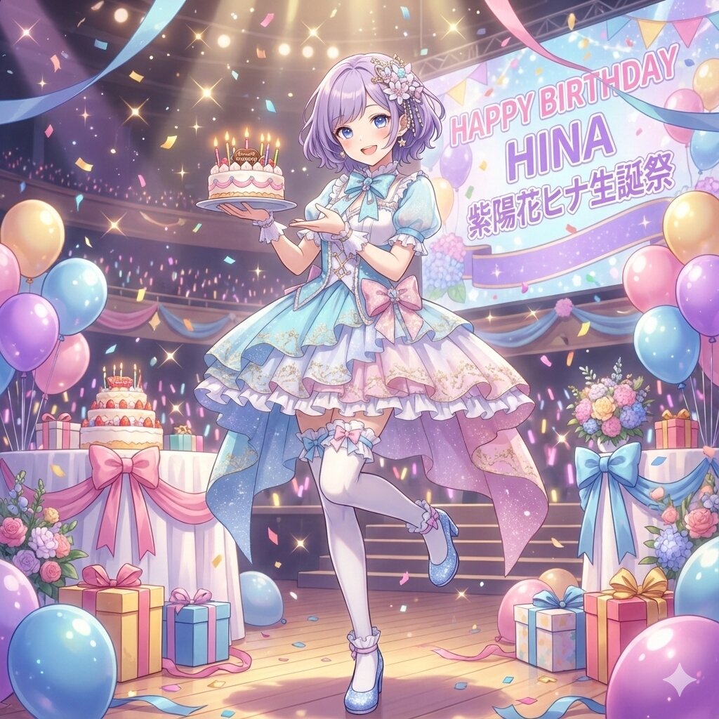 ①Geminiの画像生成を思考モードで ヒナさんの画像を添付して次のプロンプト。 「この画像をポーズを変えて衣装もリライト、美しくかわいいアイドル。」 ②出来た画像に次のプロンプト。 「紫陽花ヒナの誕生祭のワンシーン、ポーズを変えてリライトしてください」 完成