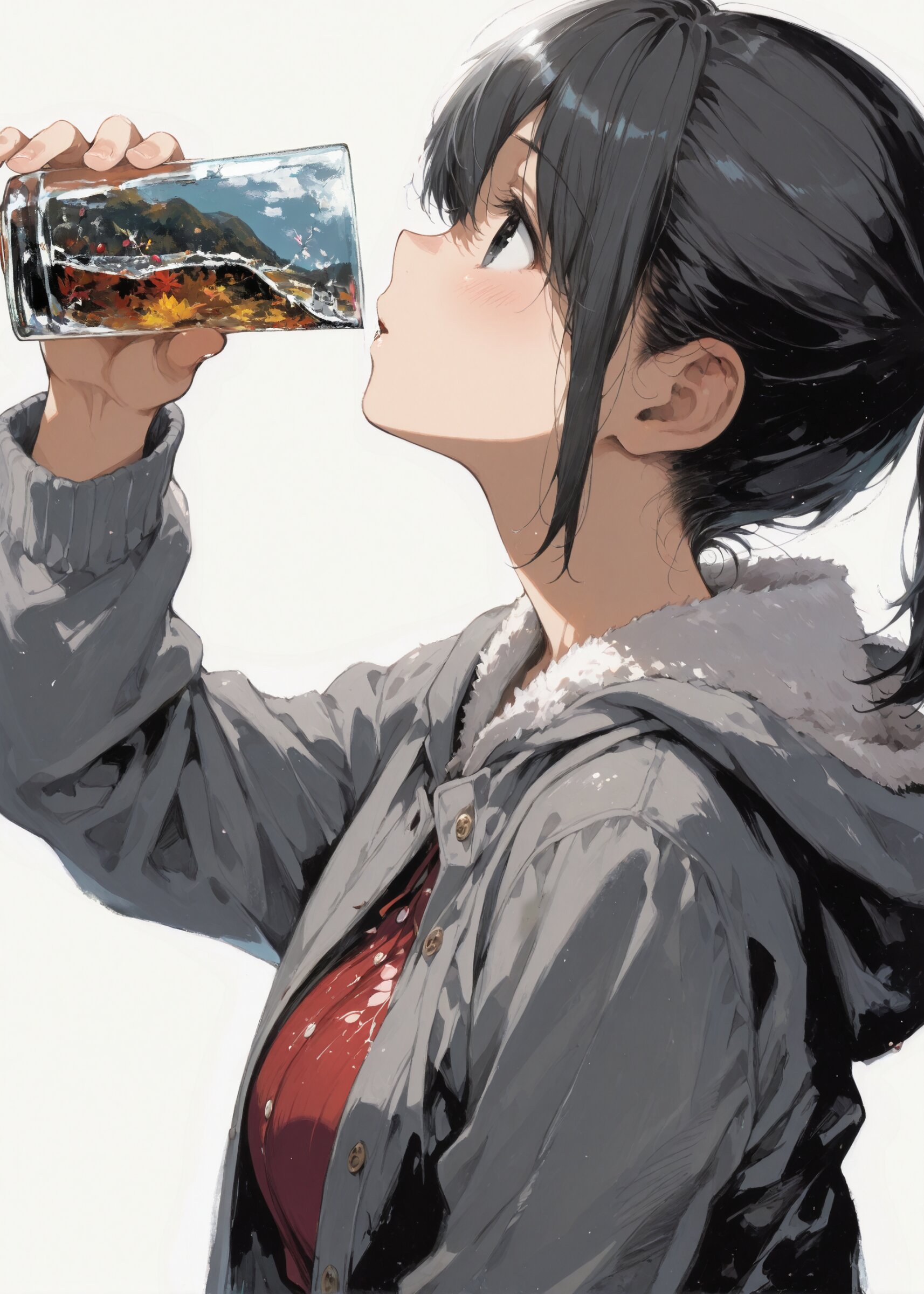 Best quality, Masterpieces, simple background, negative space, anime-style illustration, white background, fine detail, A girl raises her glass as she looks back on the year. Memories of the past twelve months float before her eyes. An assemblage of recollections. Spring, summer, autumn, winter—seasonal memories, landscapes, the summer sea, spring cherry blossoms, autumn leaves, winter skies., 1girl, (young girl), cute face and eyes, big breasts, black hair, clear black eyes, single short ponytail hair, cute and lovely, Vigorous, lively, and spontaneous personality, cinematic angle, official art, official wallpaper