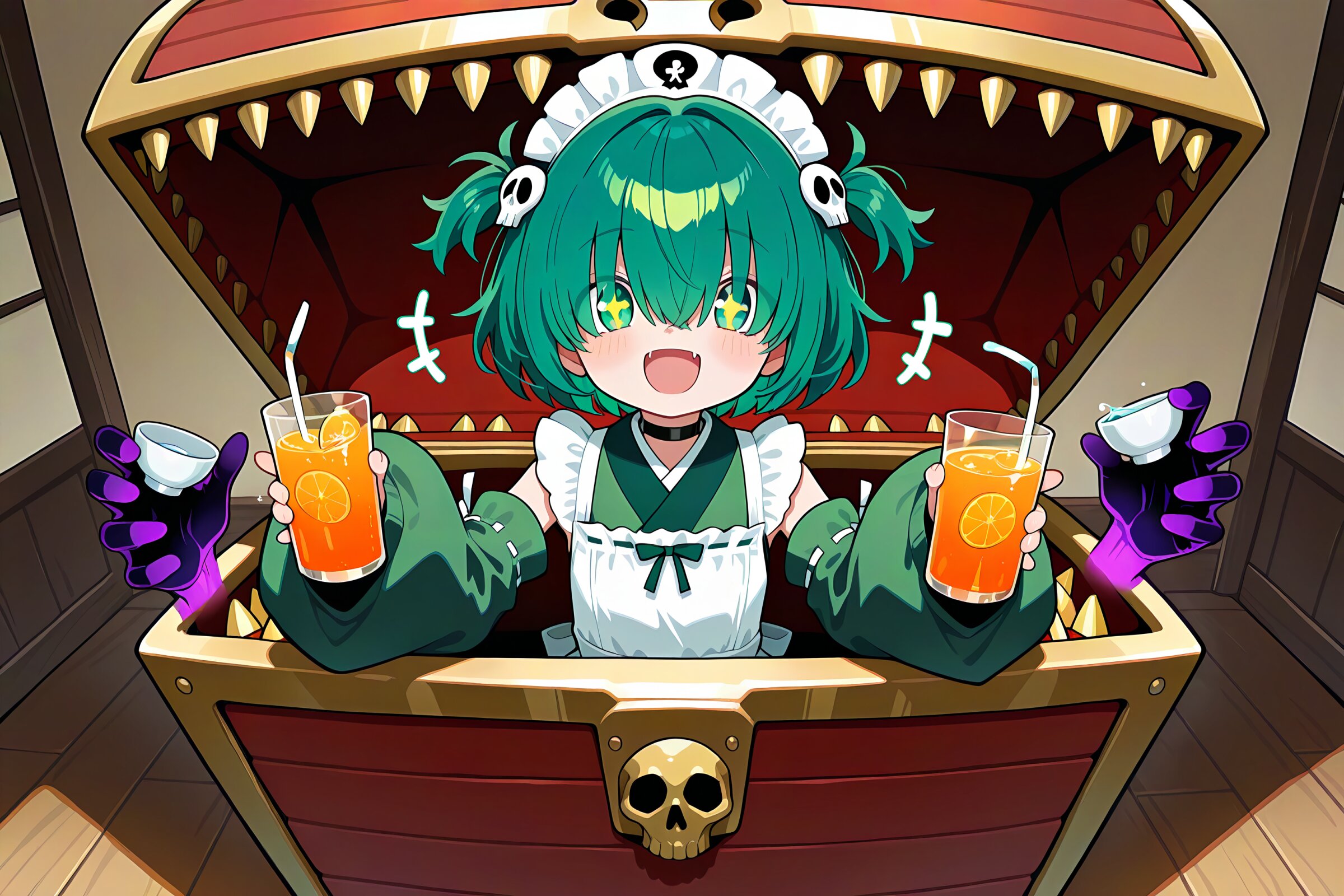 1 little girl, solo, masterpiece, best quality, amazing quality, very aesthetic, cobalt green hair, short hair, messy hair, (hair over eyes:1.2), green eyes, demon fangs, +_+, open mouth, smile, cheerful, +++, notice lines, choker, green wa maid outfit, (oversized sleeves:1.2), detached sleeves, skull hair ornament, in mimic chest, holding orange juice, holding choko \(cup\), sake in cup, choko (cup), filled with sake, clear liquid, liquid surface, slight splash, small splash, (floating black ghosty hands:1.2), japanese room,
