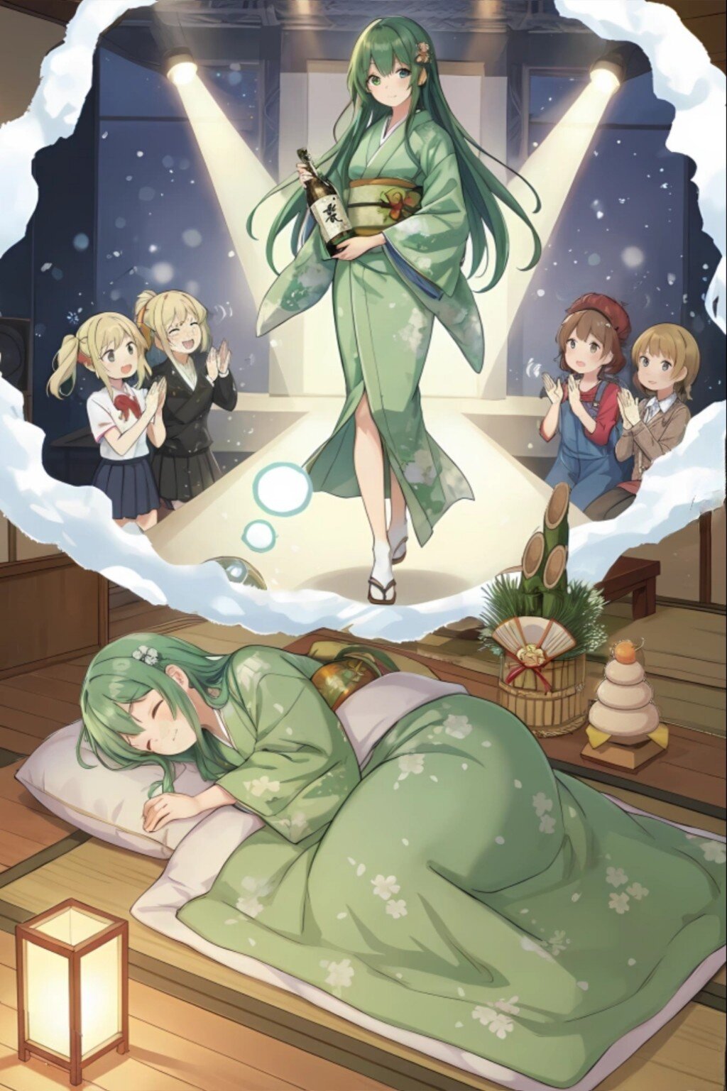 A split image, with the bottom half showing a young woman with long green hair sleeping peacefully on a futon in a traditional Japanese room. She is wearing a green kimono with white floral patterns. Next to her, a small lantern emits a warm glow, and traditional New Year's decorations like kadomatsu and mochi are visible. In the upper half, emerging from a thought bubble above her head, the same woman is depicted in a dream-like state, standing confidently on a brightly lit stage under spotlights. She is wearing the same green kimono and holding a bottle of sake. Several younger girls, some in school uniforms and some in casual attire, are looking up at her with admiration and applause. The overall style is anime, with soft lighting and a warm, dreamy atmosphere.