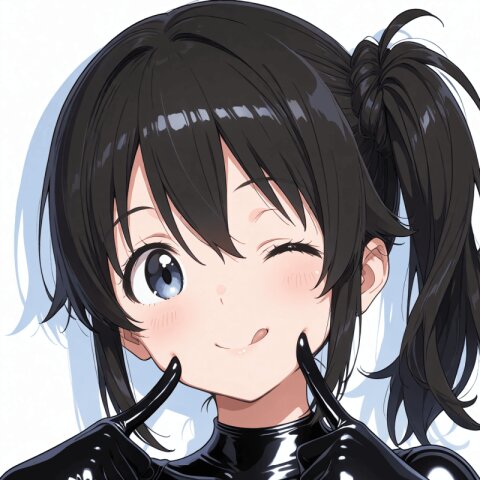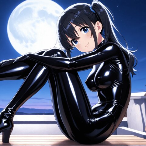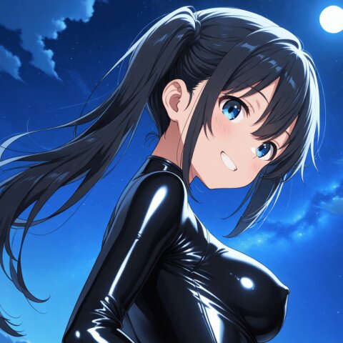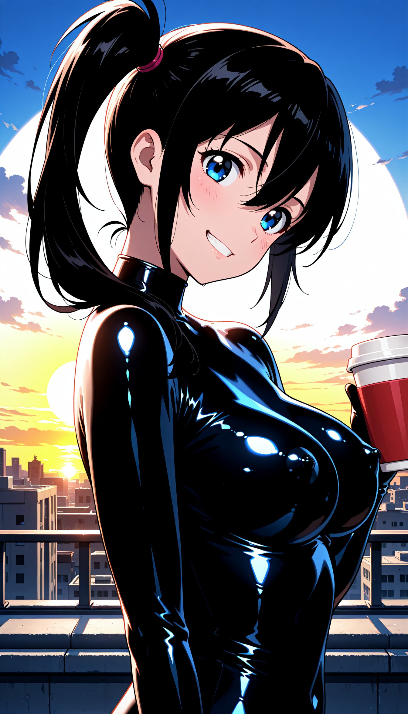 <lora:MeMax6-noob-vpred:1>,memaxl6_a,memaxl6_b,memaxl6_c,memaxl6_d,memaxl6_e, Full HD,32K, 1girl, (solo), upper body, from side, (teenage :1.3), (blue eyes), long hair, (((side ponytail))):2.0, (((sideburns))), (((hair between eyes))), (((tareme))), (((black hair))), (beautiful hair), (shiny hair), (medium breasts), slender, blush, shiny clothes:1.8, ((((((black latex bodysuit:1.4)))))), ((black latex clothes:2.0)), (((skin tight))) ,(((tight clothes))),((((seamless clothes)))), ((((((((shiny black latex bodysuit, shiny clothes, )))))))), ((black latex gloves)),((((no zippers)))), (covered nipples:1.6), erectile nipples, (light smile, head tilt, grin, ), ((looking at viewer)), (holding drink, coffee), (morning, sunrise, rooftop, outdoors, ), natural lighting:1.2, (high contrast):1.4, anime, anime screencap, , Full HD,32K,masterpiece,best quality, super fine illustration, very aesthetic, absurdres, newest, hyper detailed, intricate, beautiful, aesthetic, highly decorative, HDR, yume kawaii, 10's anime style,
