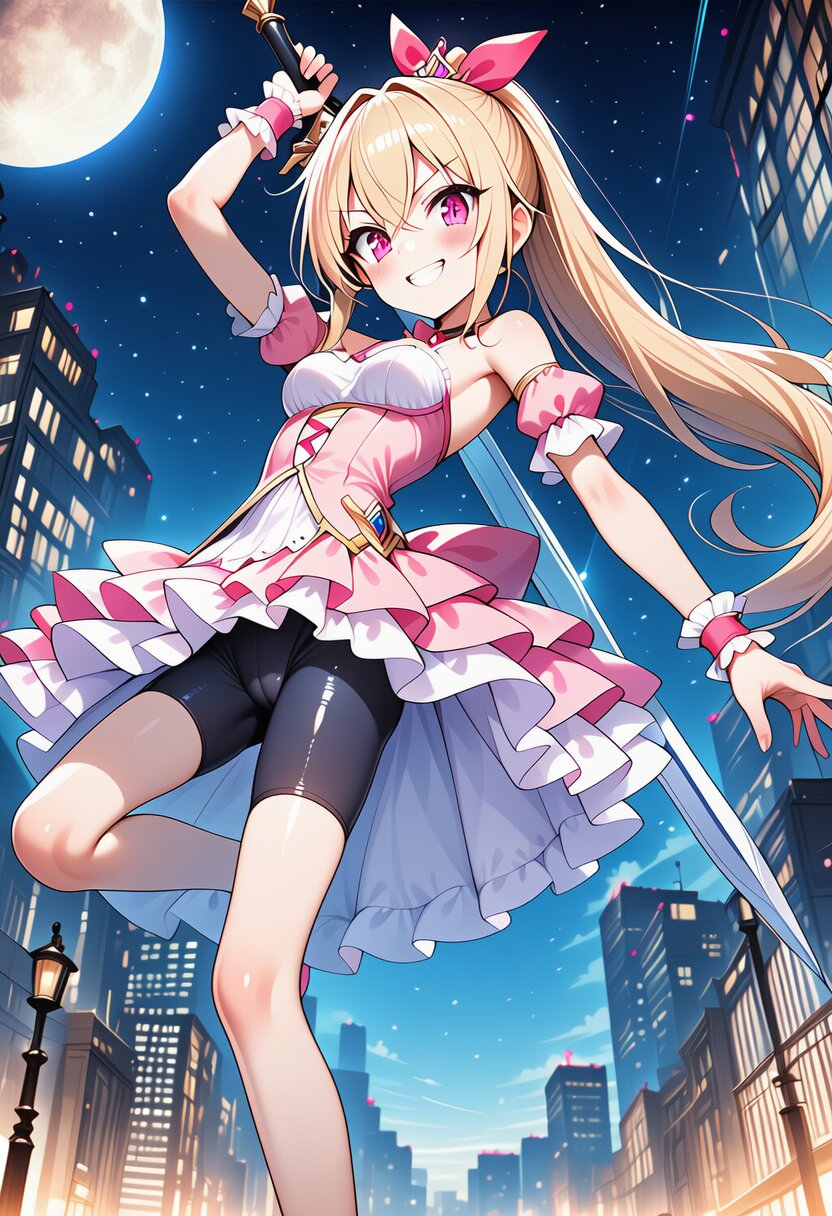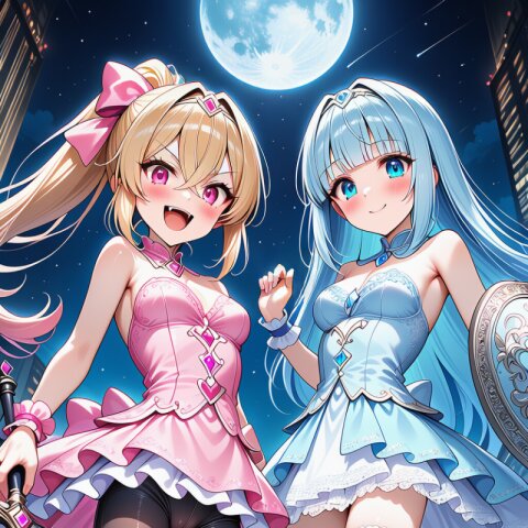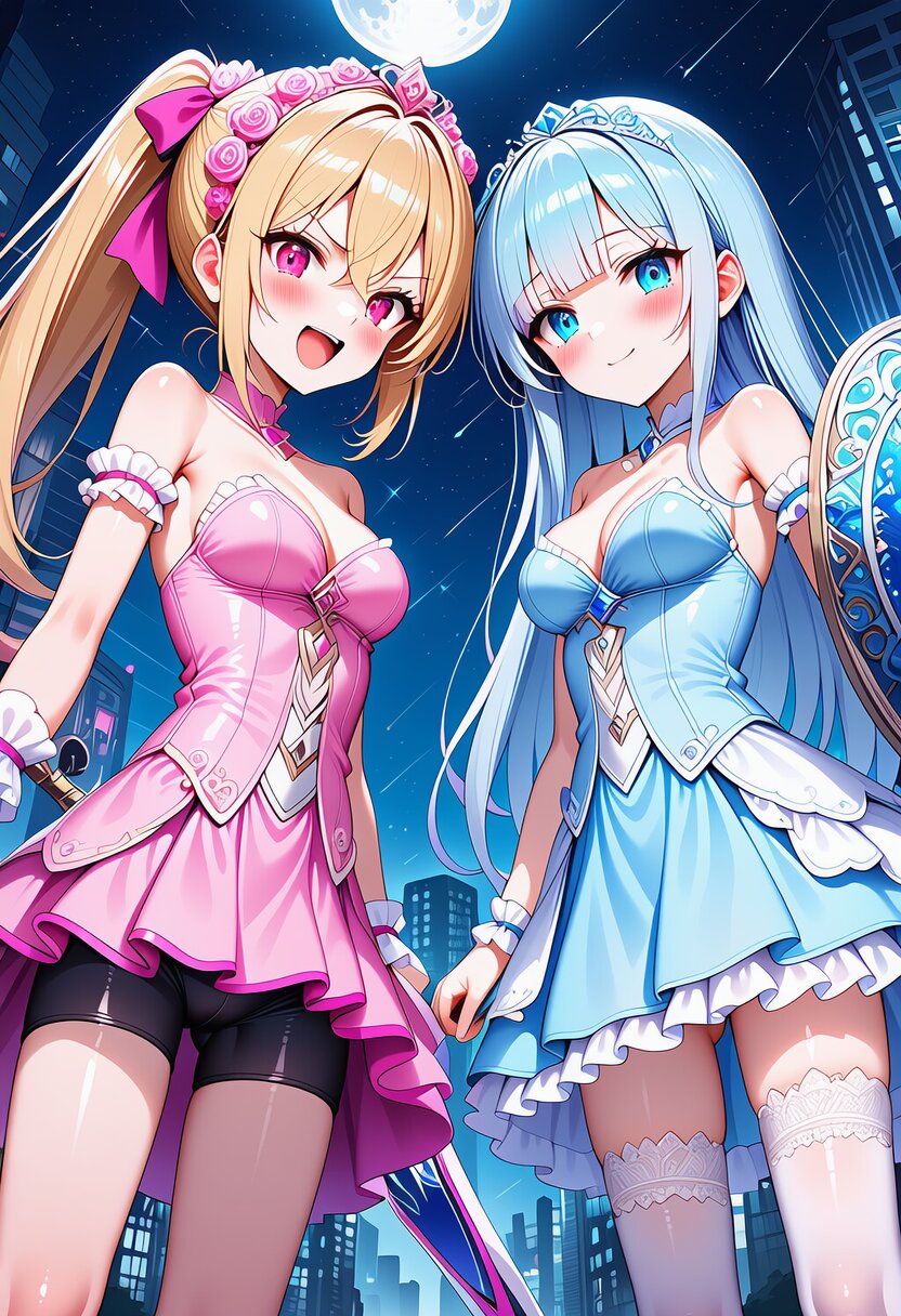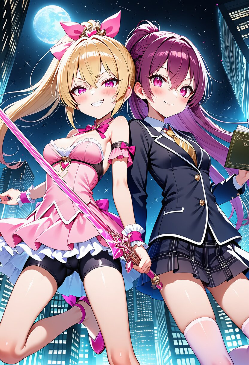 ai-generated, year 2024, anime style, 2girl, back to back, flying in mid-air, midnight, moonlight, outdoor, in metro city, from below, masterpiece, best quality, ultra detailed, perfect fingers, high resolution, absurdres, perfect anotomy, detailed background, unity 8k wallpaper, location, very aesthetic, masterpiece, no text
