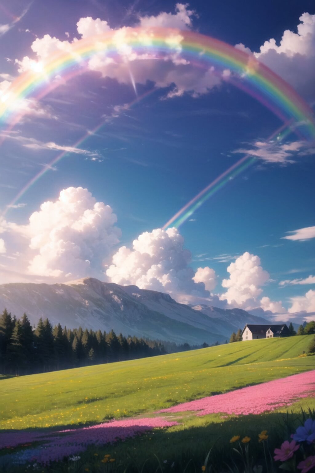 Whimsical rainbow arcing over a peaceful meadow,