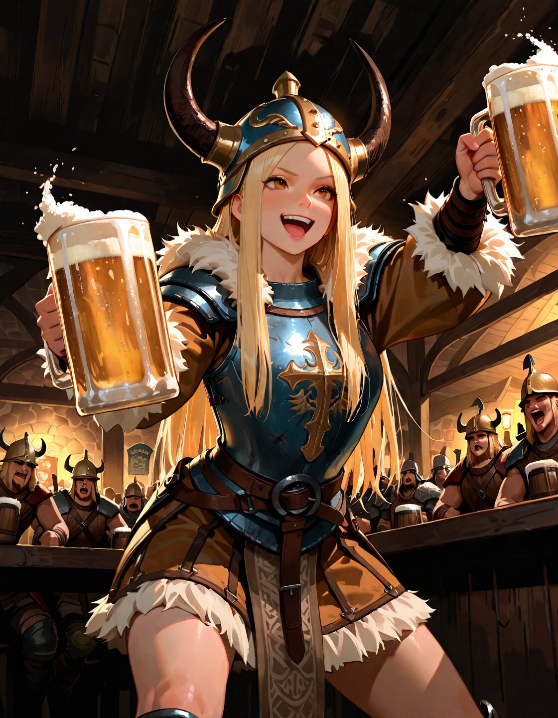 solo,long hair,straight hair,blonde hair,(forehead:1.3),(center parted bangs:1.3),amber eyes,delicate face,detailed face,detailed skin,delicate hair,detailed hair,masterpiece,best quality,insanely detailed,beautiful,16k,photorealistic, Viking,warrior,delightful,proud,(war cry:1.2),(big laugh:1.3),(Viking helmet:1.3),axe,armor,(fur:1.2),Gladiator skirt,stretched arm,(advertisement of beer:1.4),(holding a big wodden beer mug:1.5),fighting stance,Nordic,in the pub,crowd,a lot of Vikings holding beer mug,romantic academia,cinematic lighting,bloom